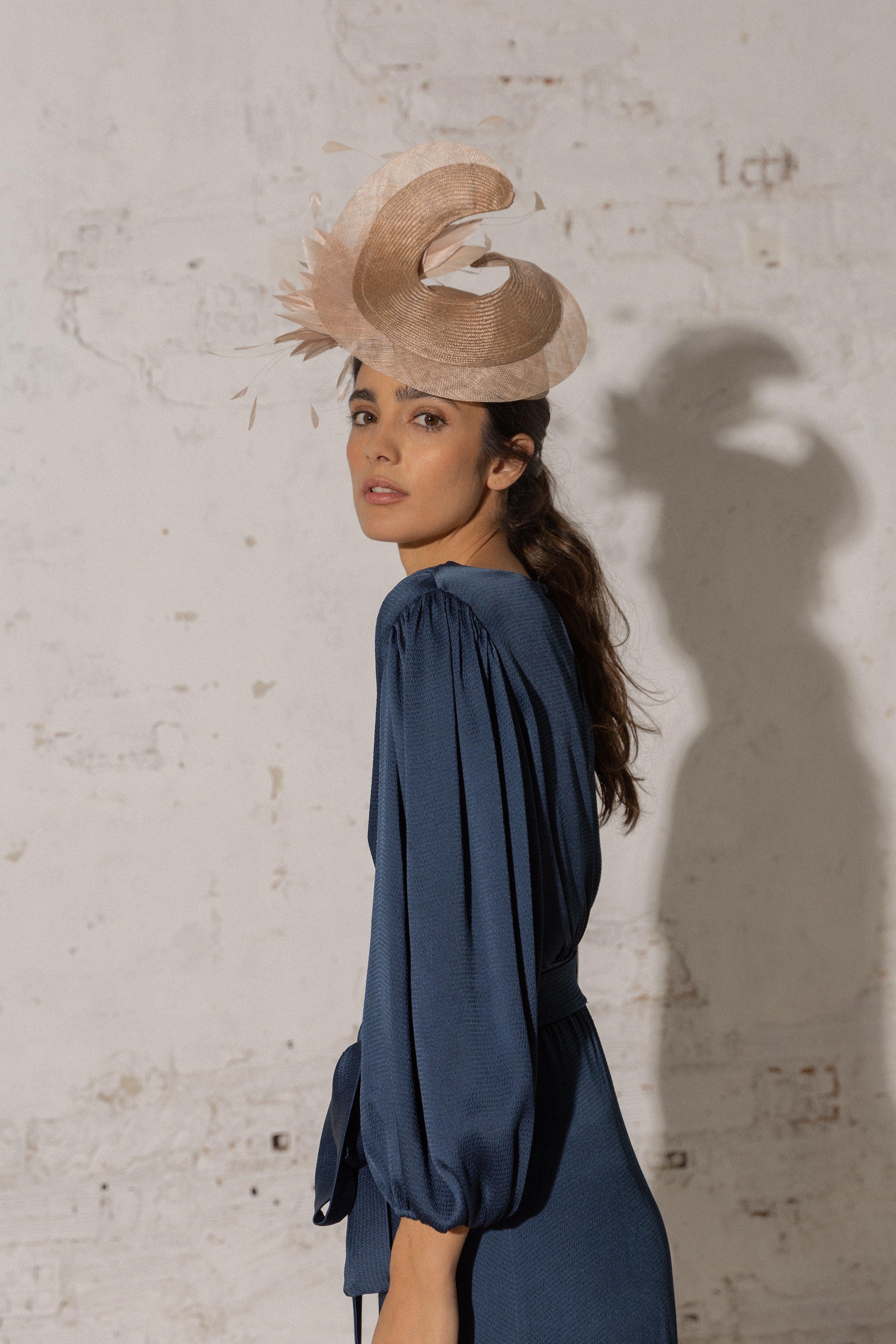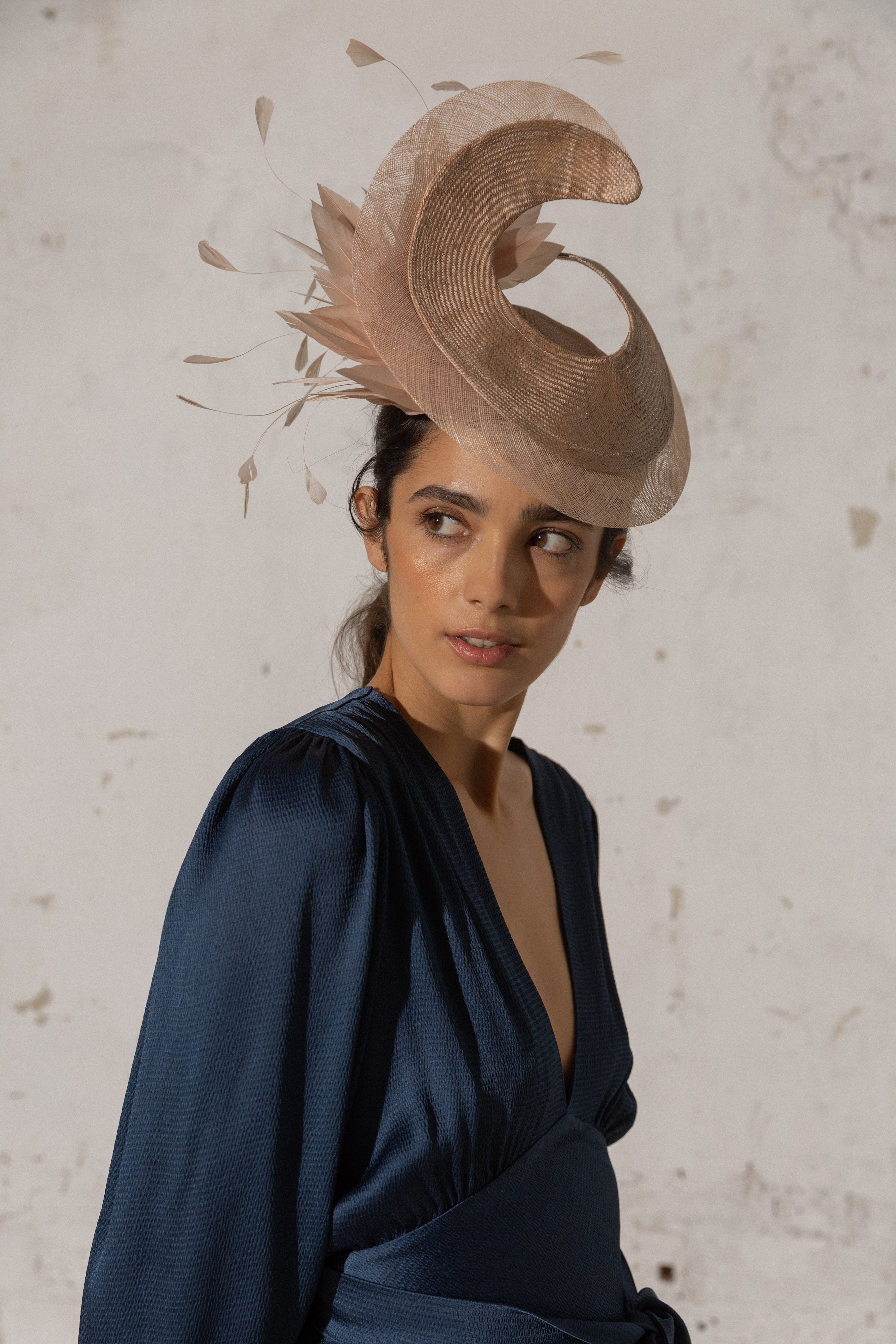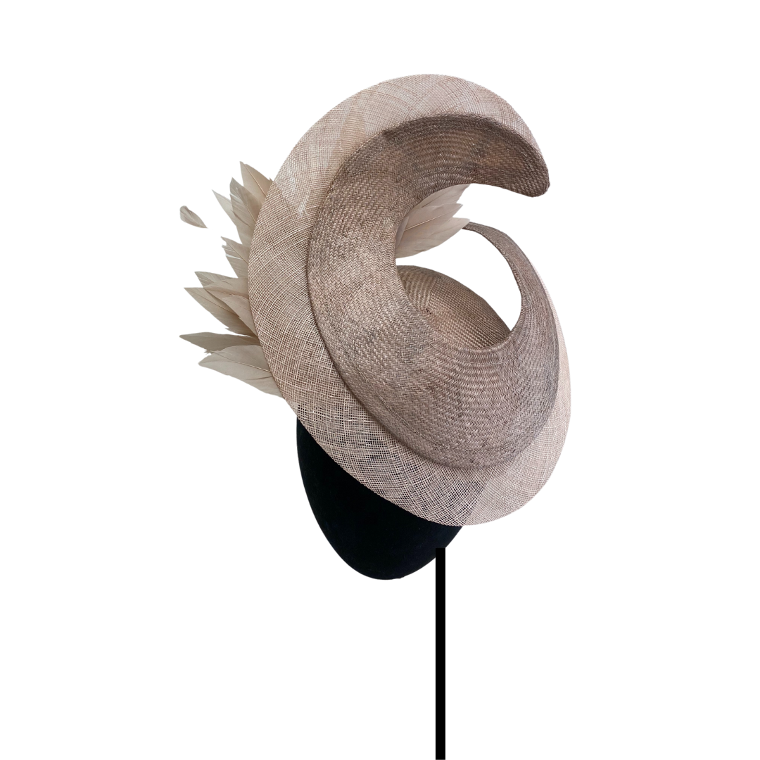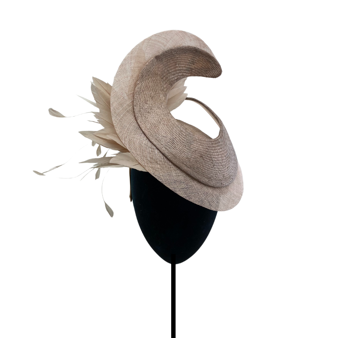 Casquete de parasisal nude con ala levantada y bies de sinamay, plumero y antenitas al tono