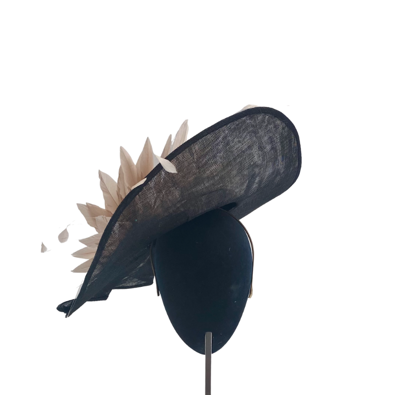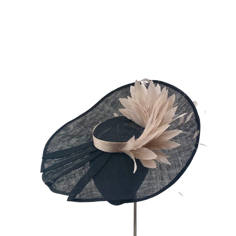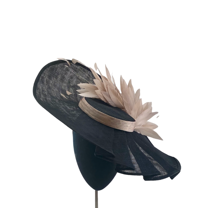 Dulcinea grande de rafia negra de pliegues con lazada de rafia de seda y plumero nude