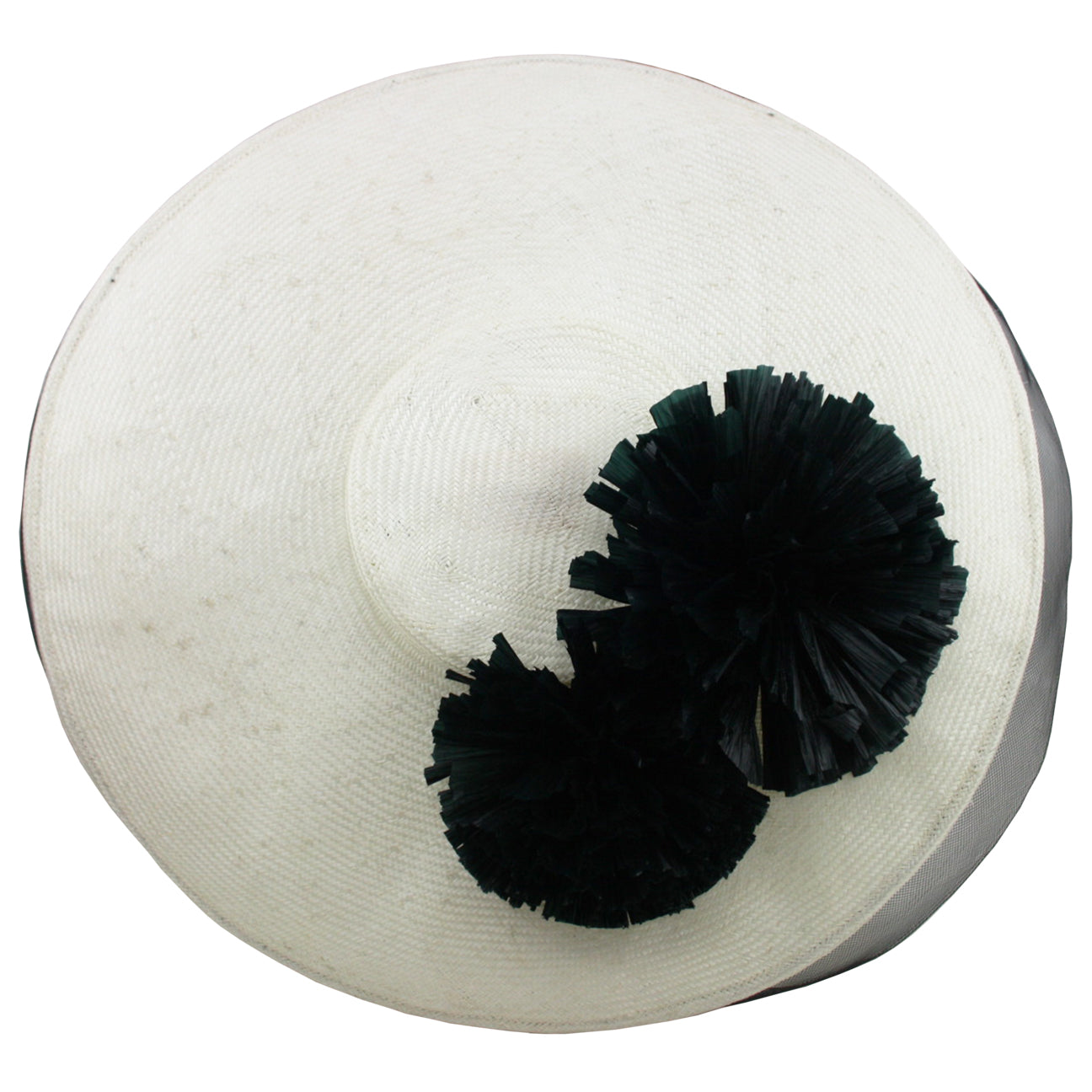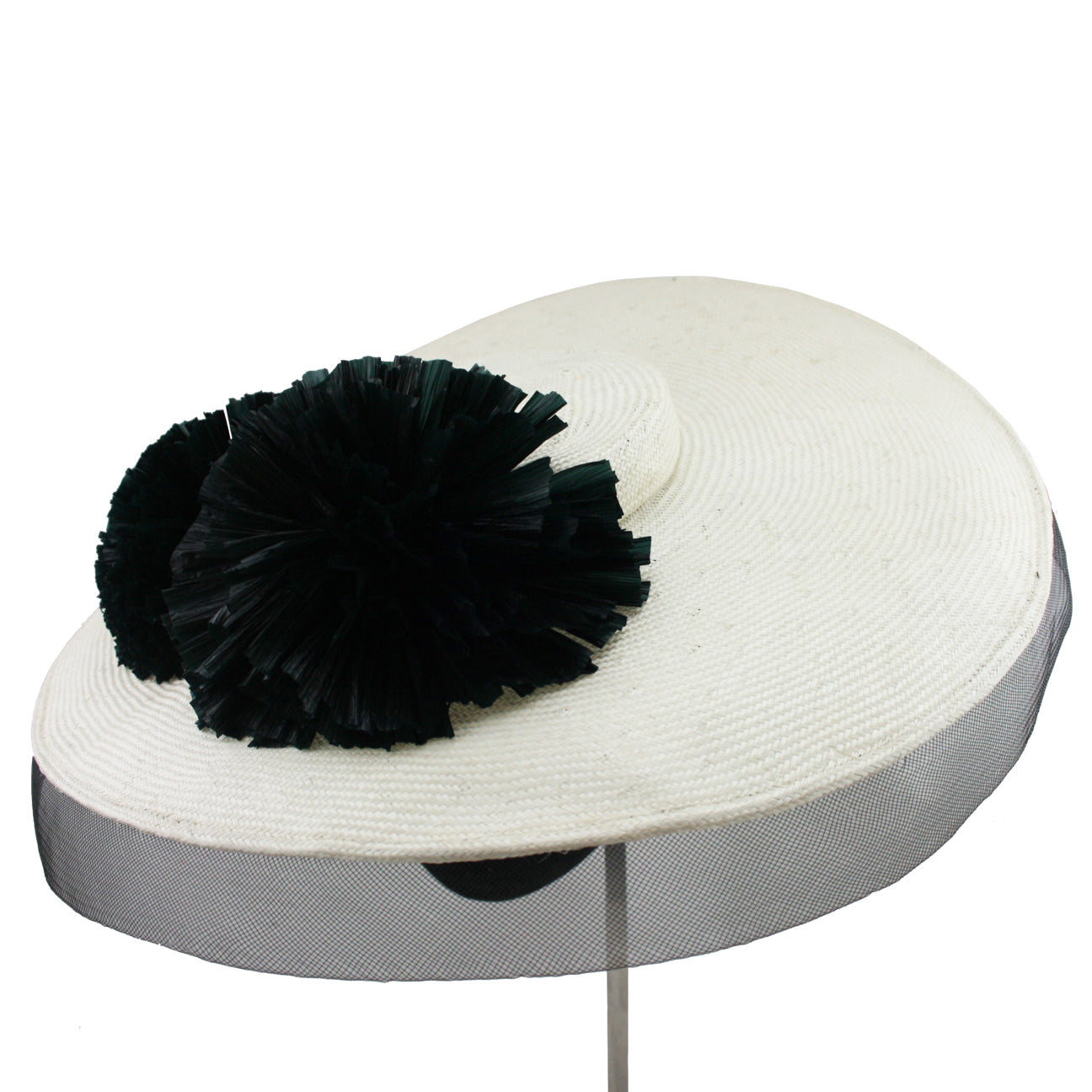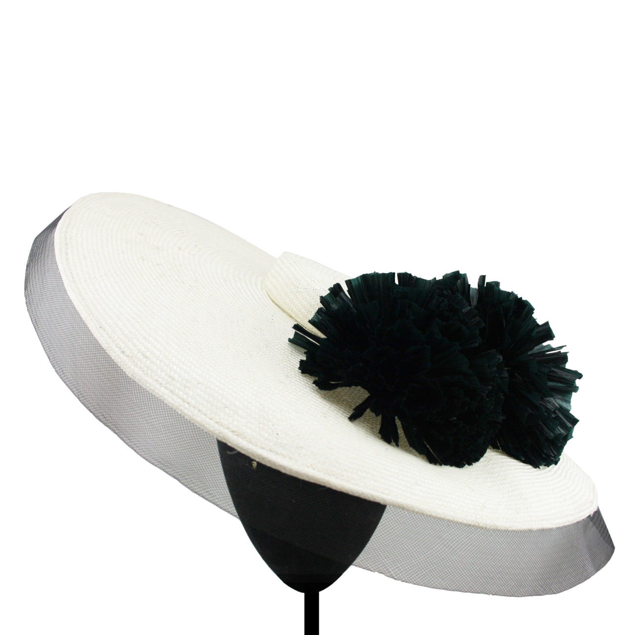 Pamela in parasisal cream with square Cup , black mane to the wing and 2 Black raffia Flowers .