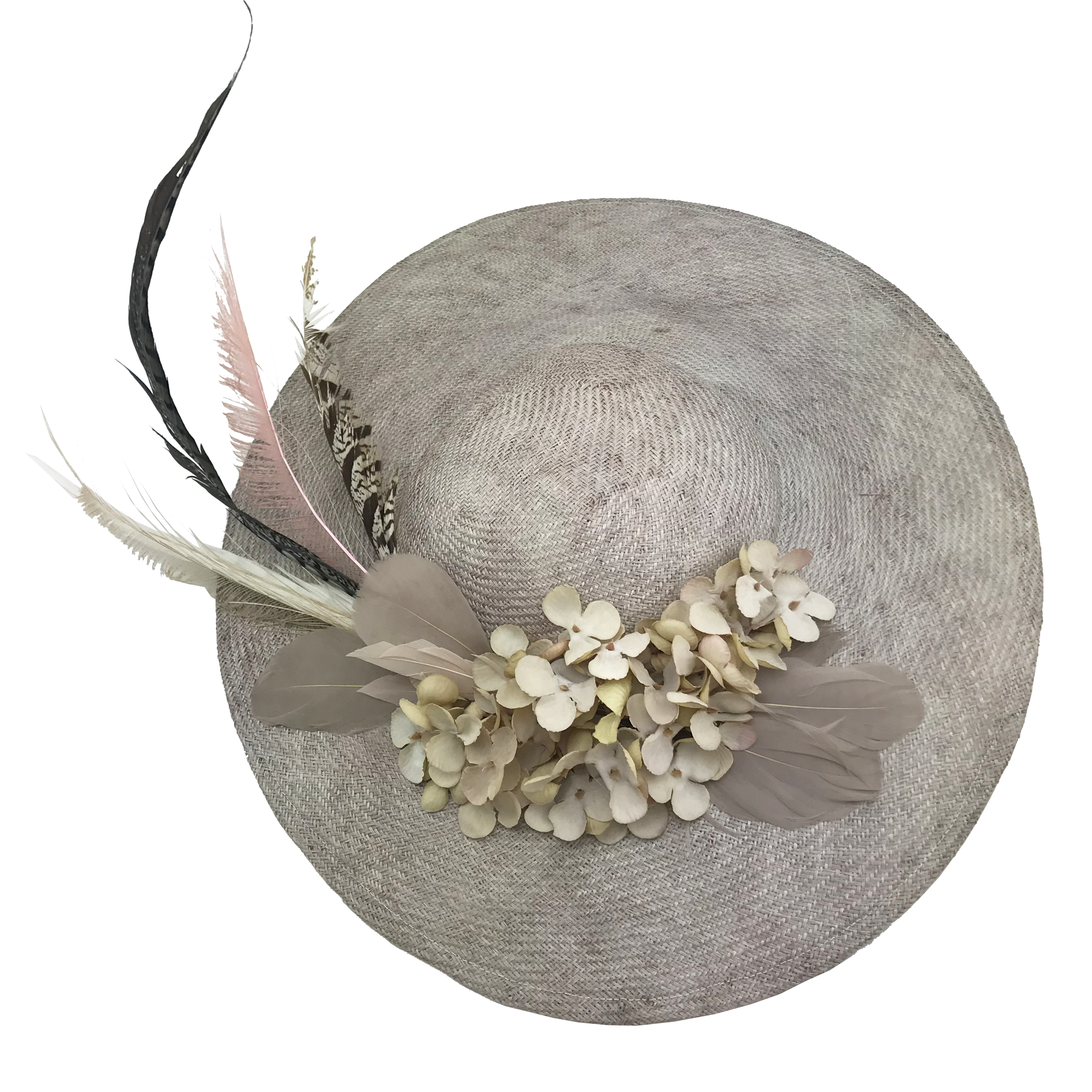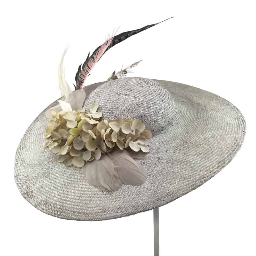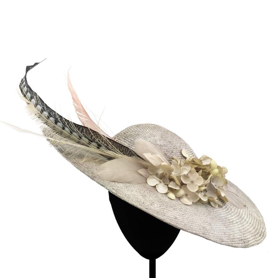 Pamela de parasisal grisácea con flores crema y conjunto de plumas faisanes y pluma quemada en tonos nude