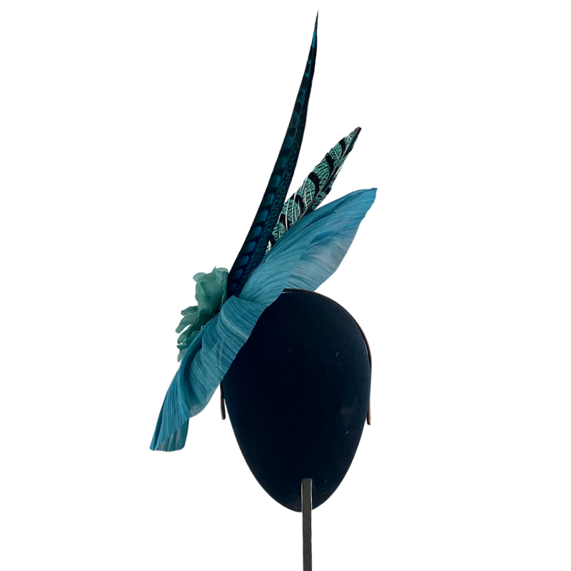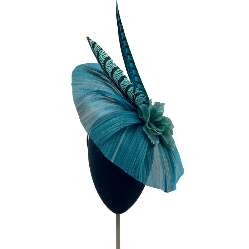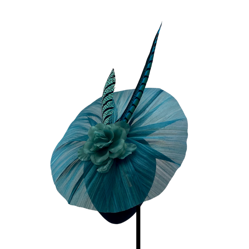 Abanico de rafia de seda verde turquesa, con flor y faisanes al tono
