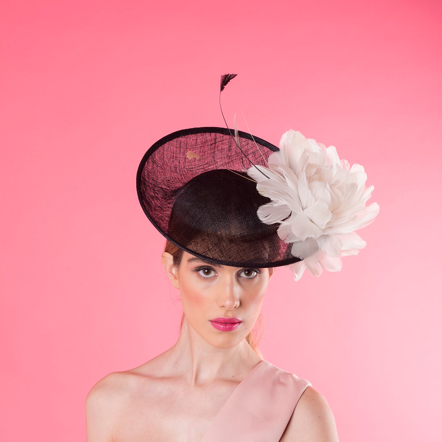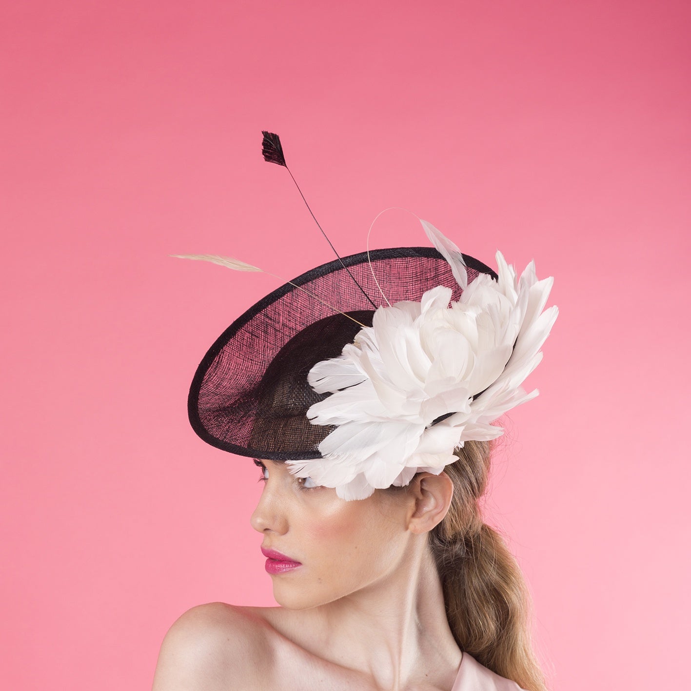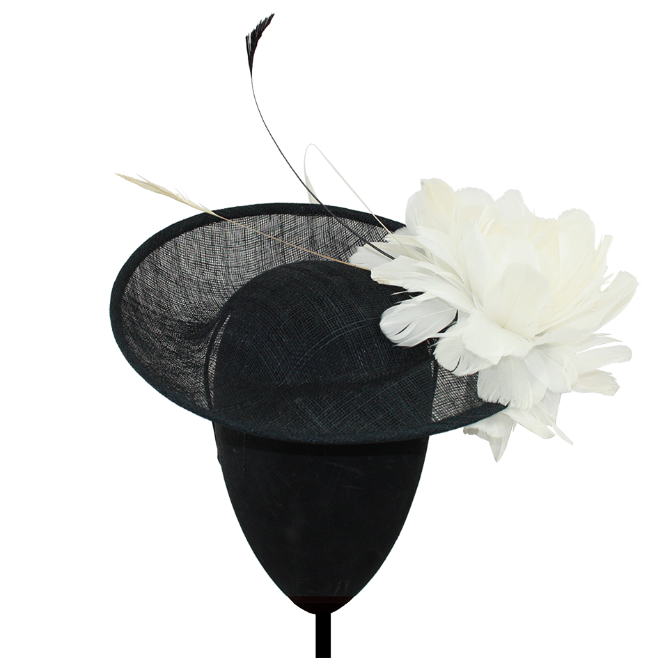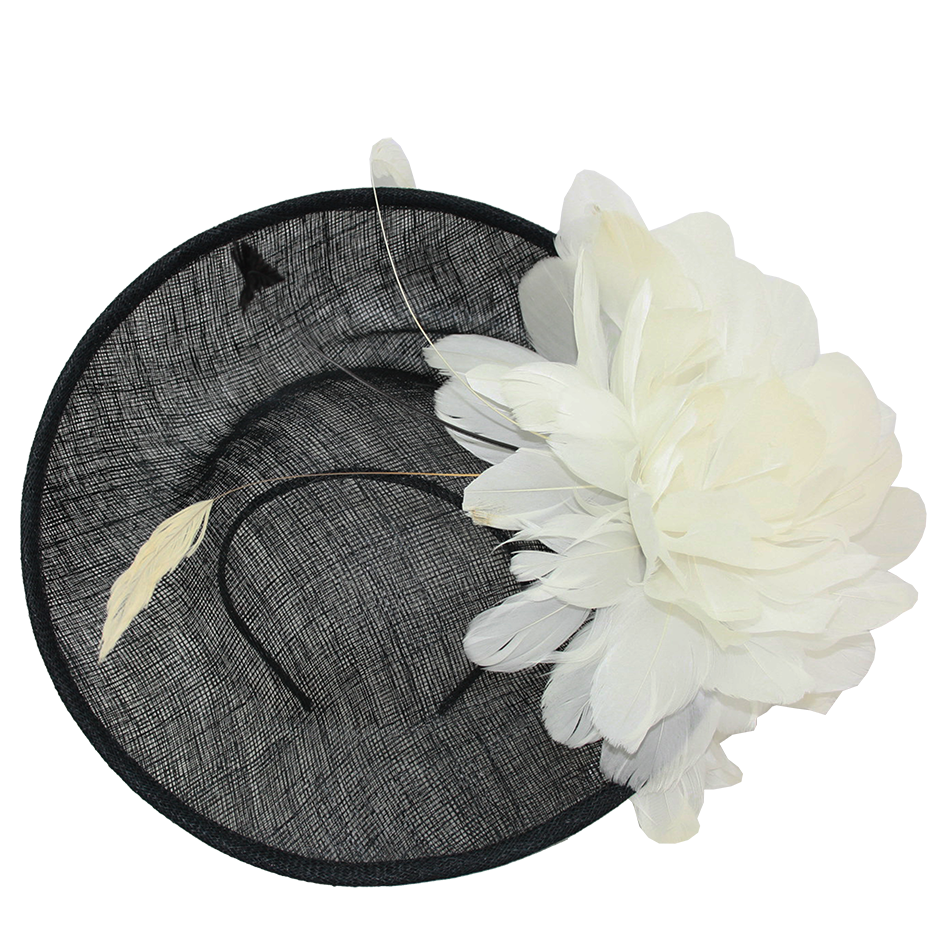 Mini dulcinea de parasisal negro con plumas pato blancas al lateral y antenas al tono
