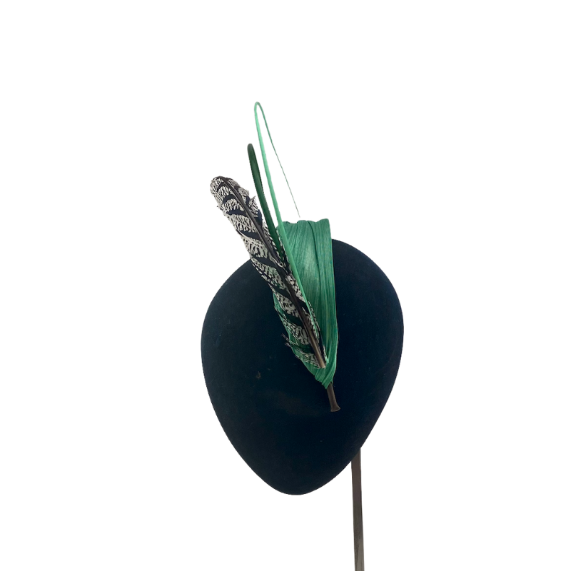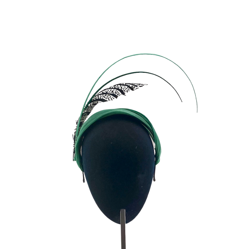 Diadema-turbante de rafia de seda verde con raqui curvado al tono y faisan natural