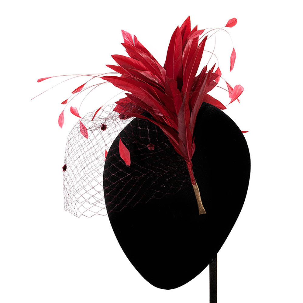 Goose Feather Headband , Red Rooster Antennas and Bordeaux Plumeti veil to face .