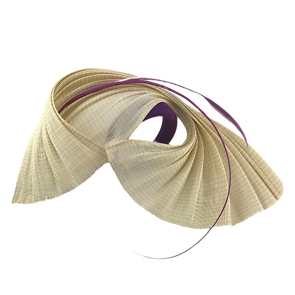 Diadema ancha malva con abanico de rafia rígida natural y raqui y pluma malva
