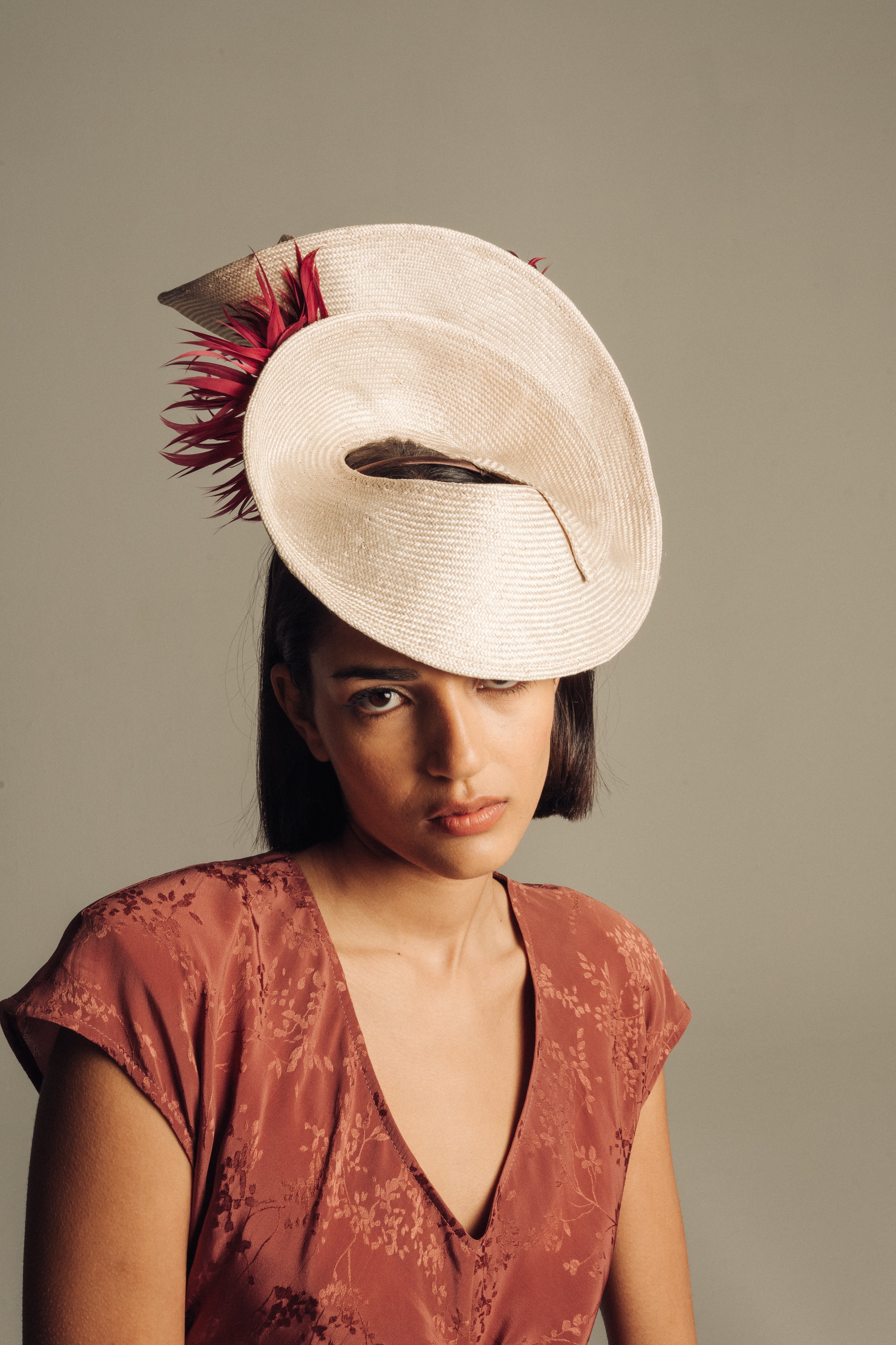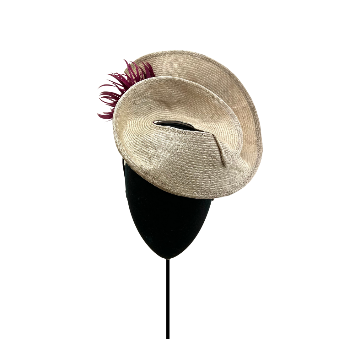 Estructura de parasisal modelado beige con flores de pluma burdeos por detrás.