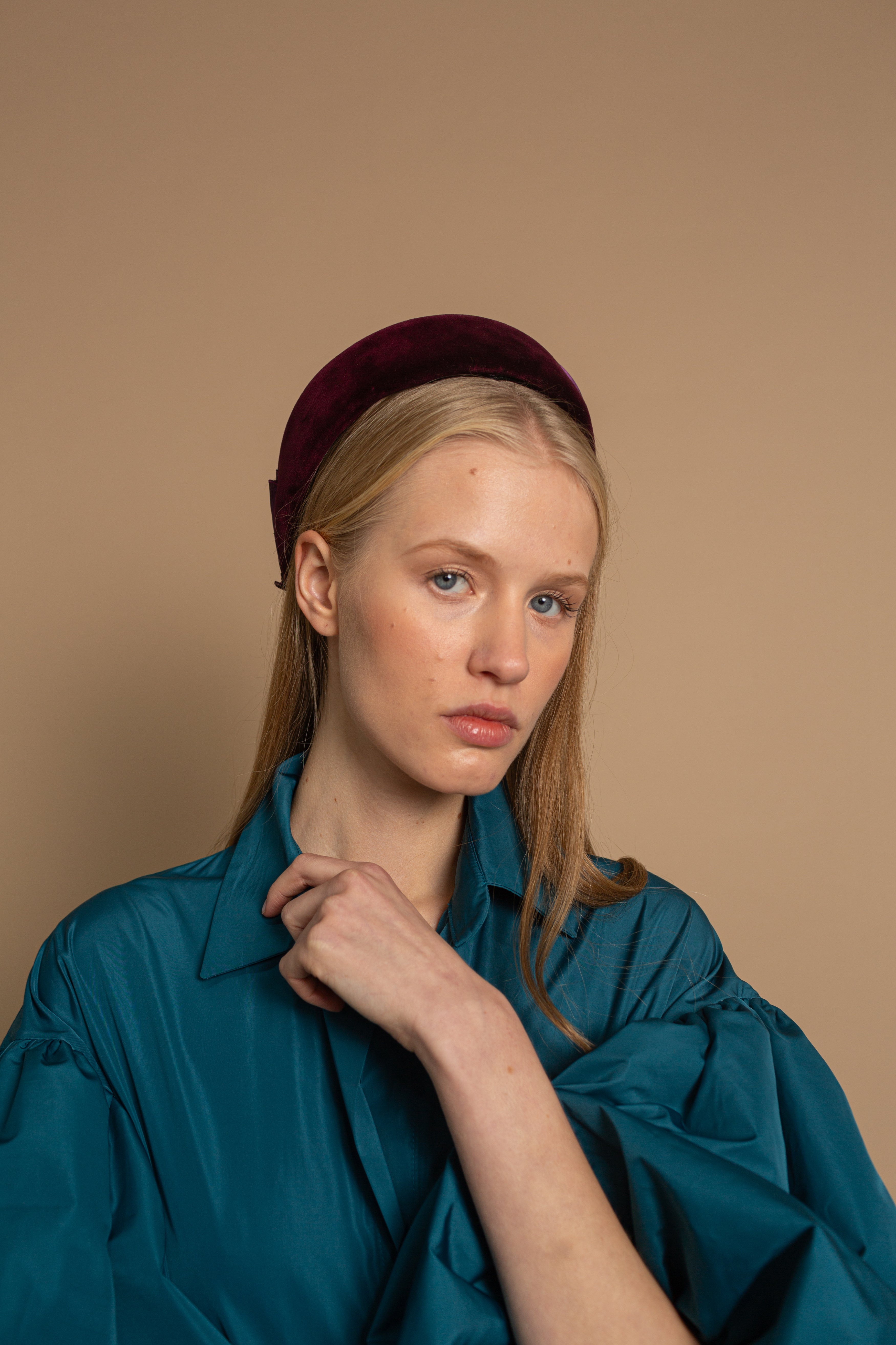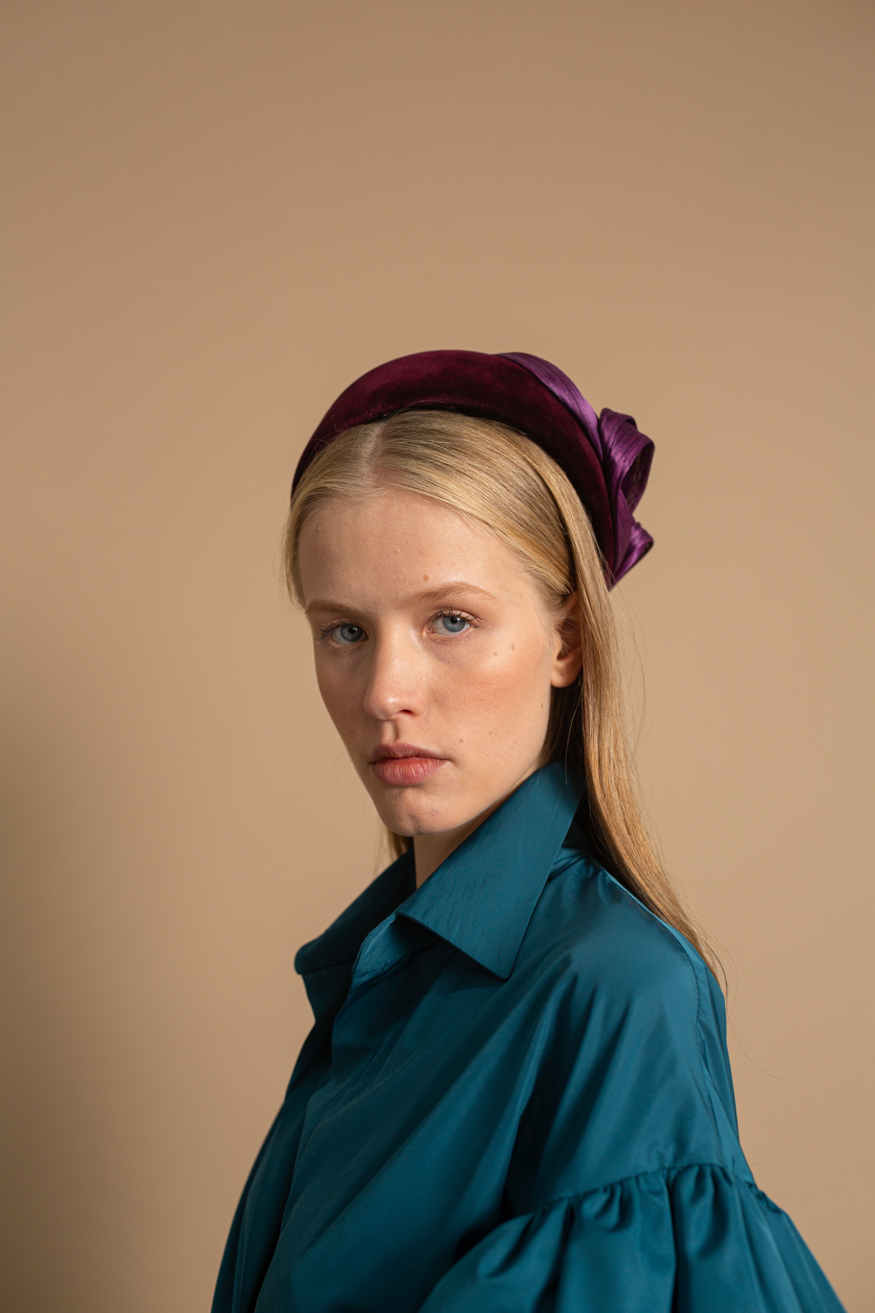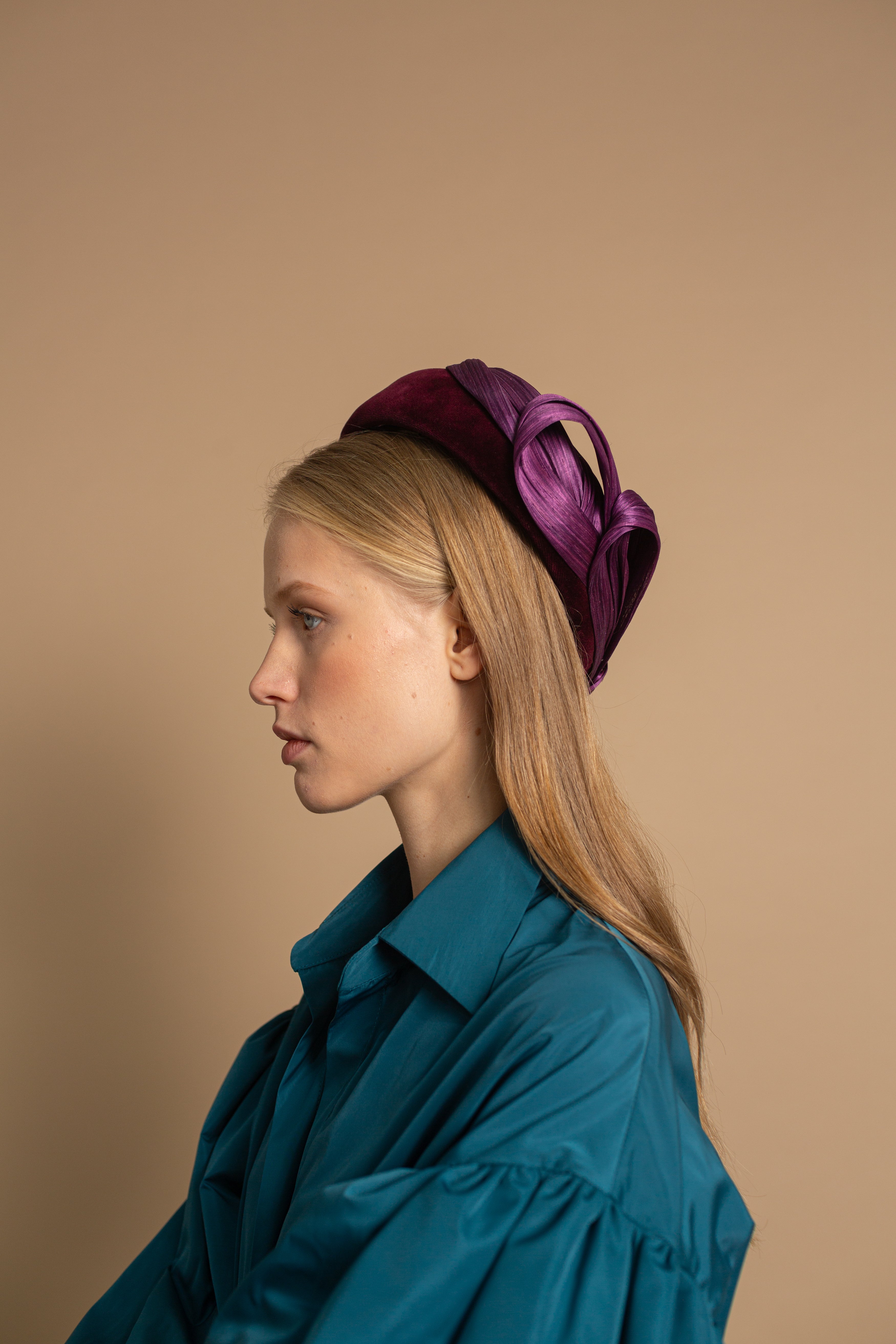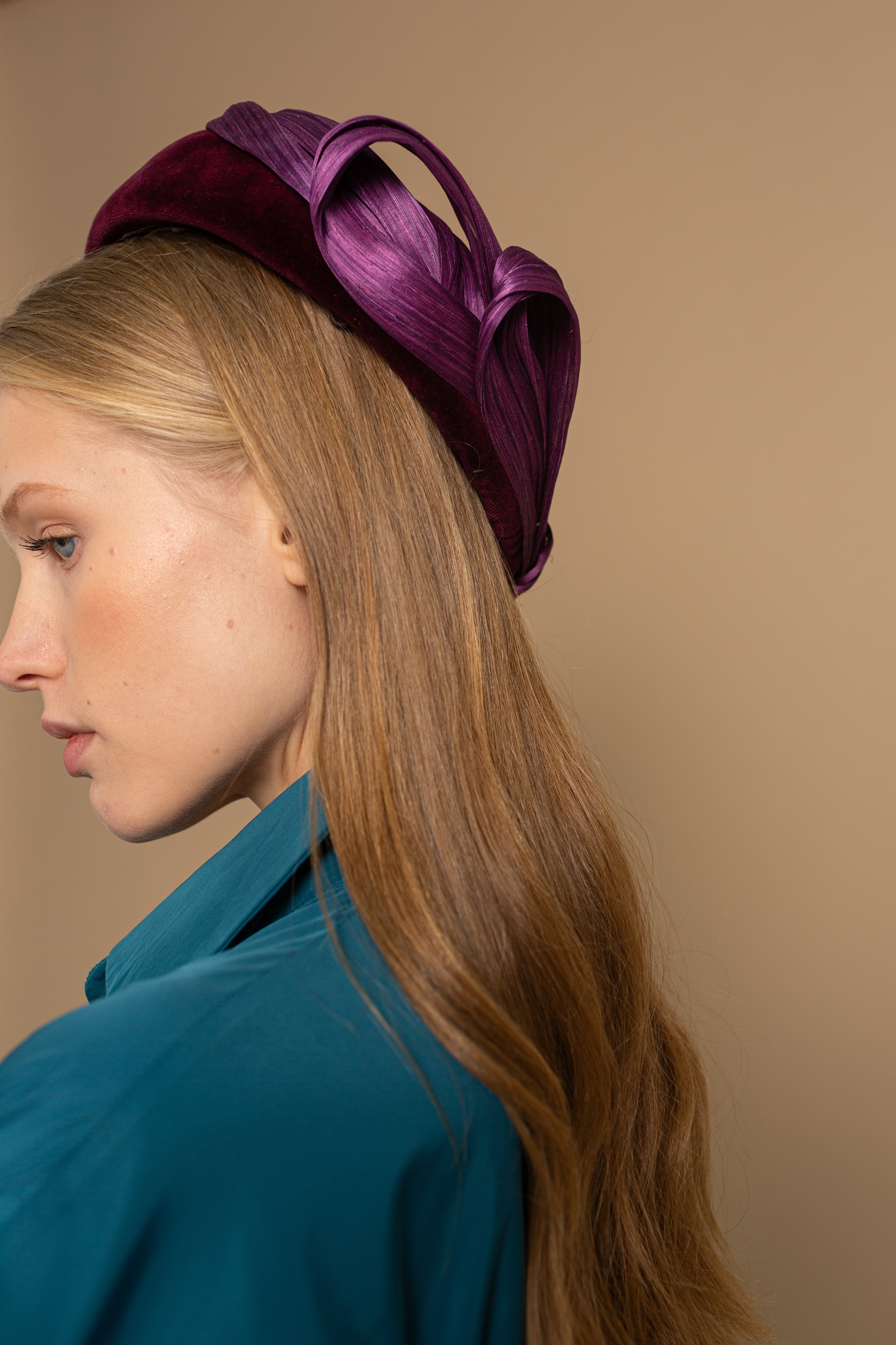 Casquete lágrima forrado de terciopelo vino con lazada de rafia de seda al tono