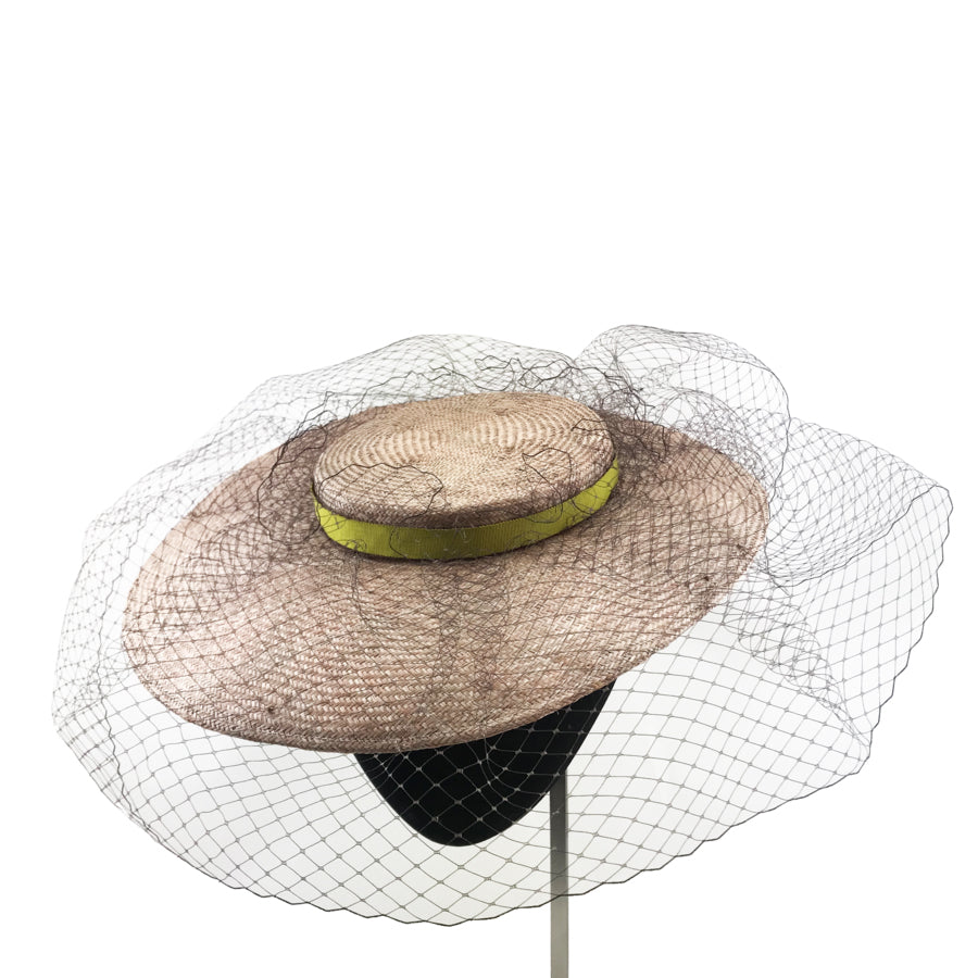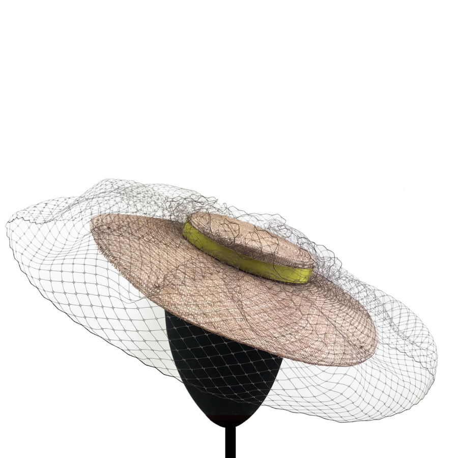 Dulcinea midi con copa cuadrada cinta pistacho y velo cubriendo todo el ala