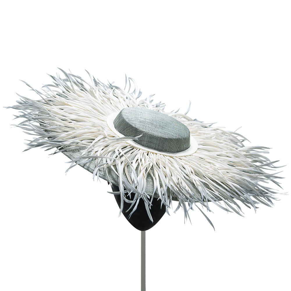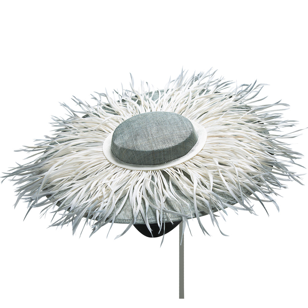 Pamela de sinamay gris azulado con plumas degradadas en el ala