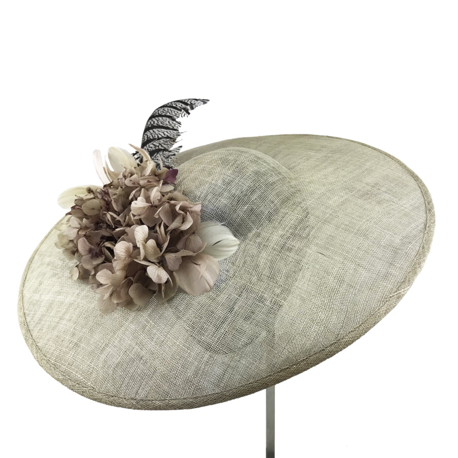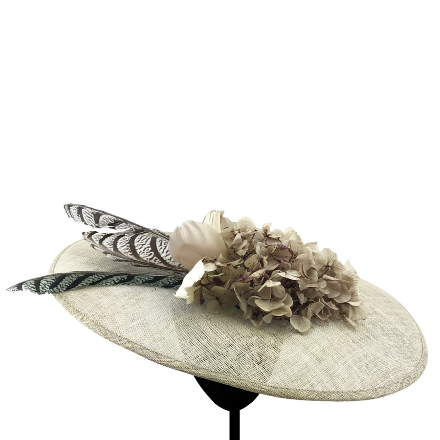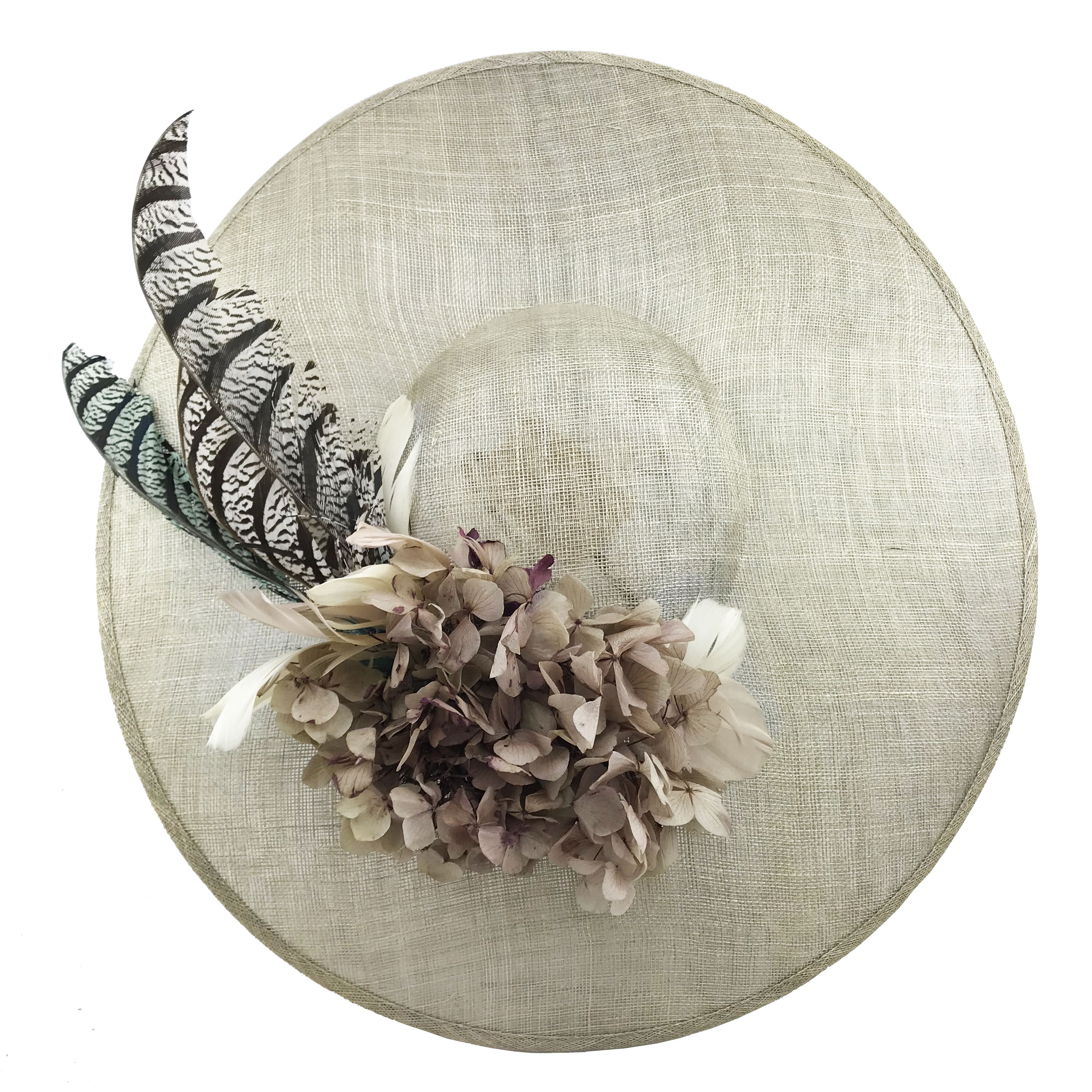 Pamela en rafia grisácea con copa redonda, conjunto de hortensias lilas y faisanes rayados