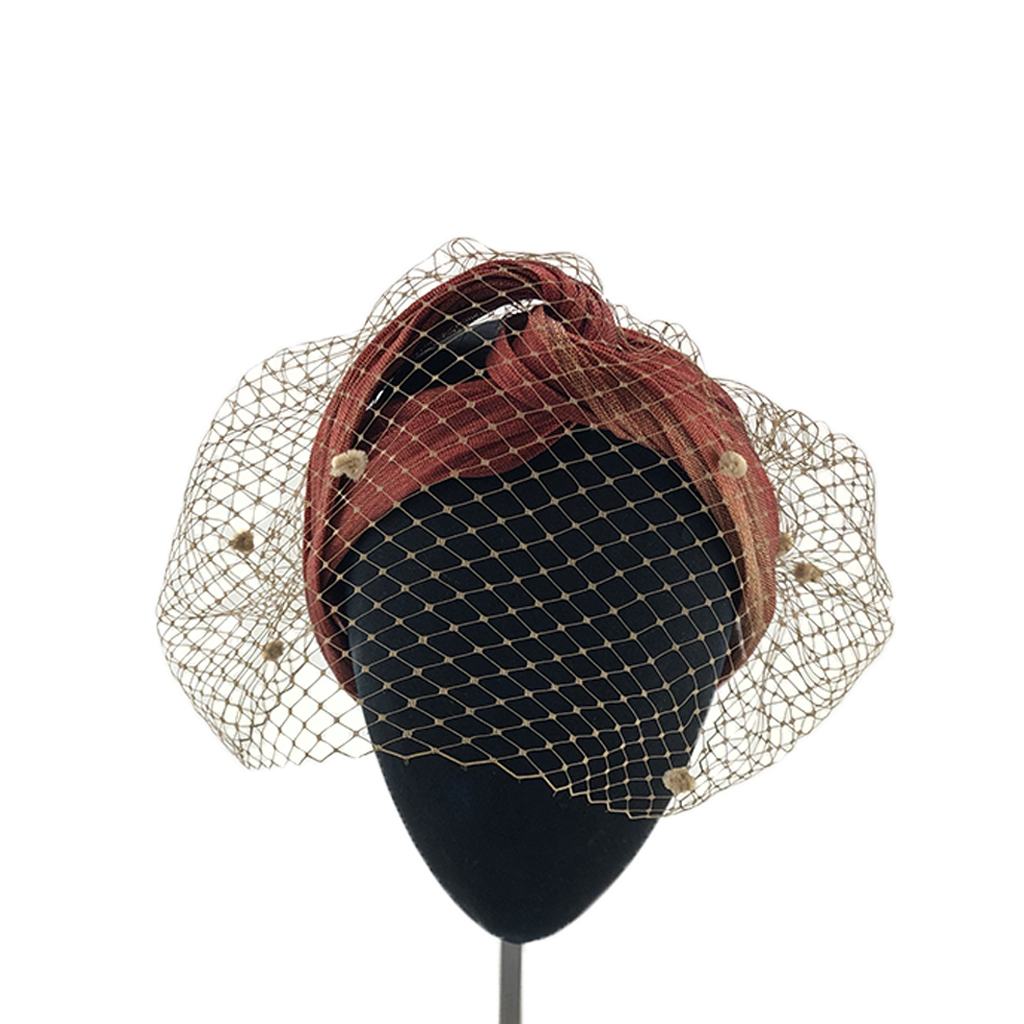 Turbante de rafia de algodon teja con velo beige y plumeti