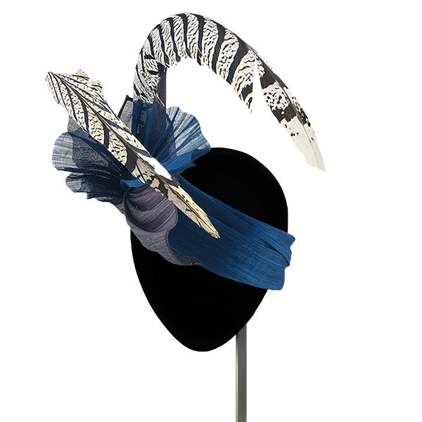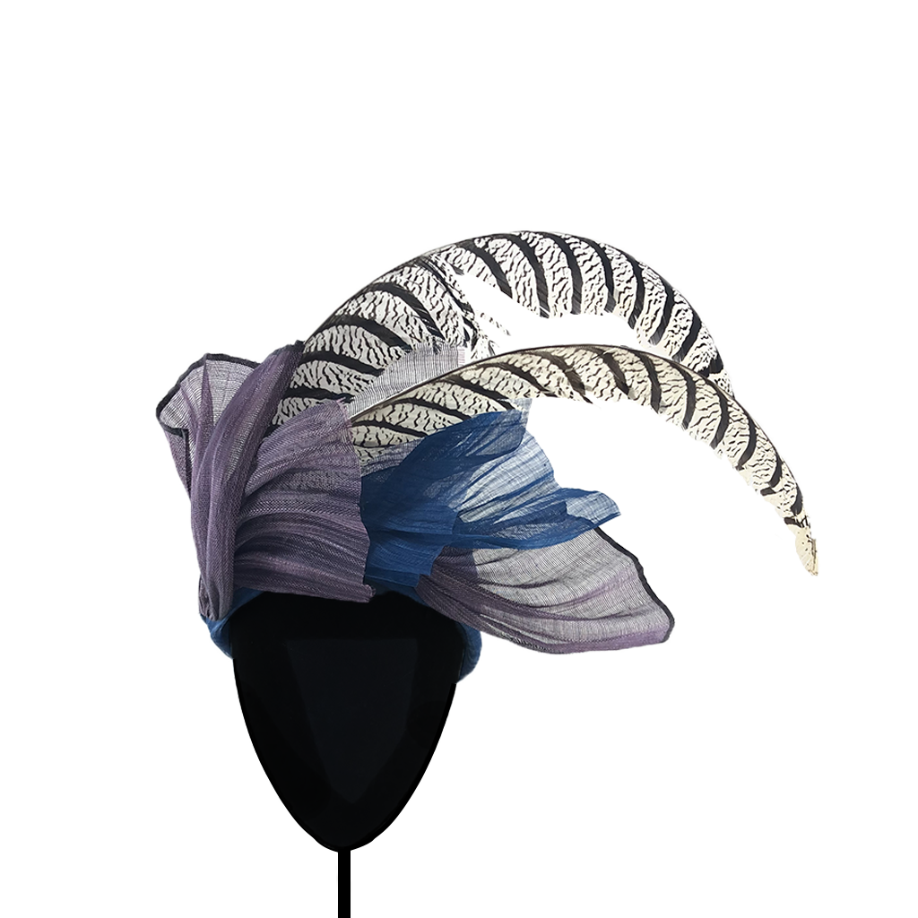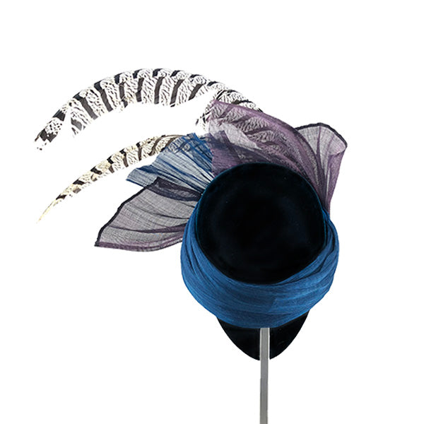 Turbante de rafia de seda con mini abanicos azul petroleo y morado y dos faisanes blanco y negro