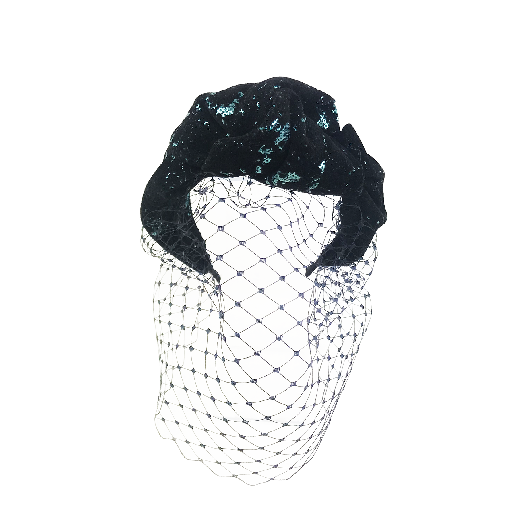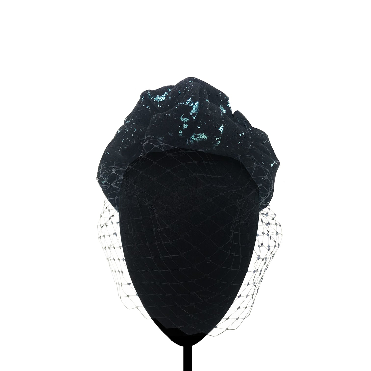 Diadema con nudo en tejido negro de terciopelo con lentejuelas verdes.