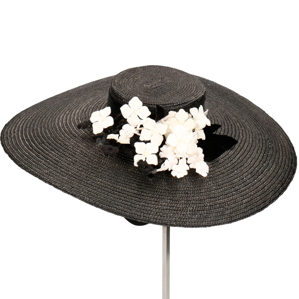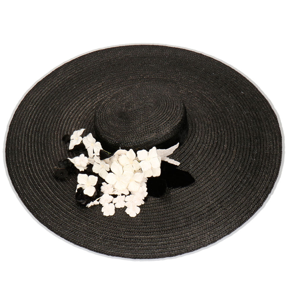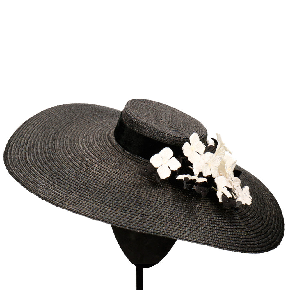 Pamela in black braided raffia with bouquet of black and white flowers and velvet ribbon .
