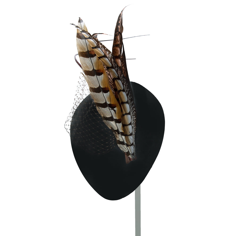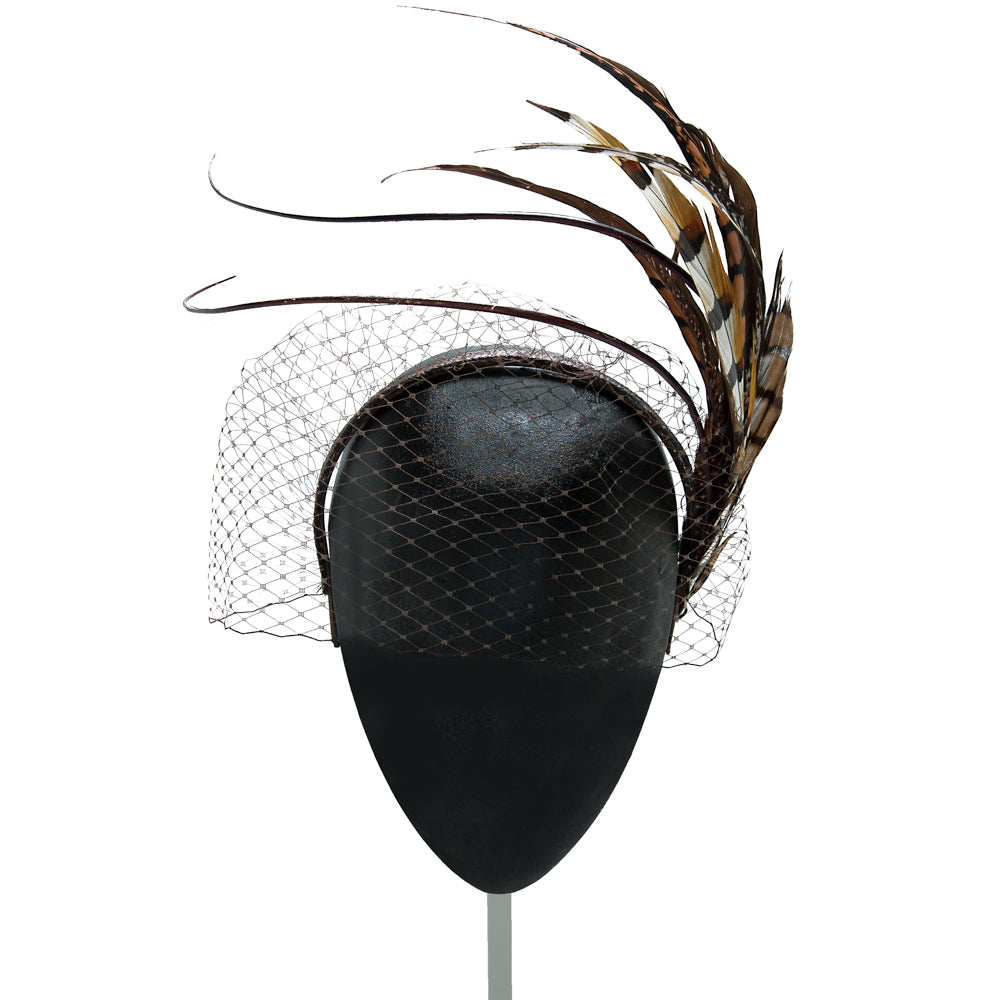 Estructura de 2 raquis curvados marrones y cuatro plumas de faisán en tonos naturales con velo a la cara