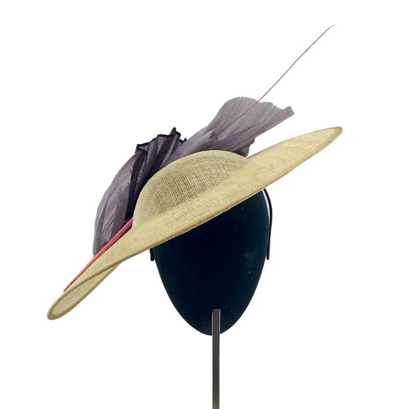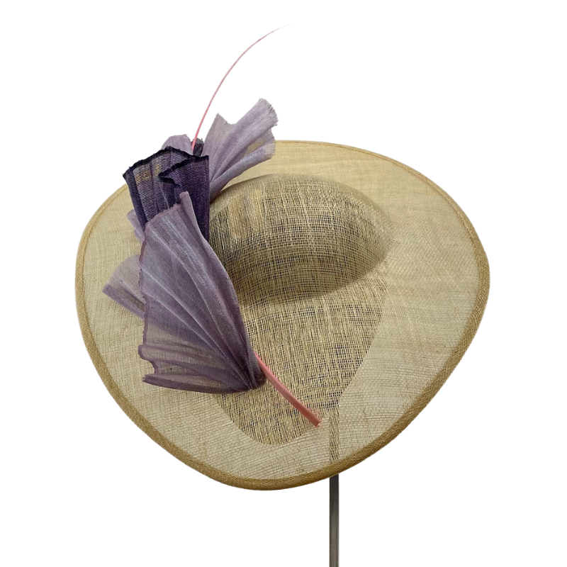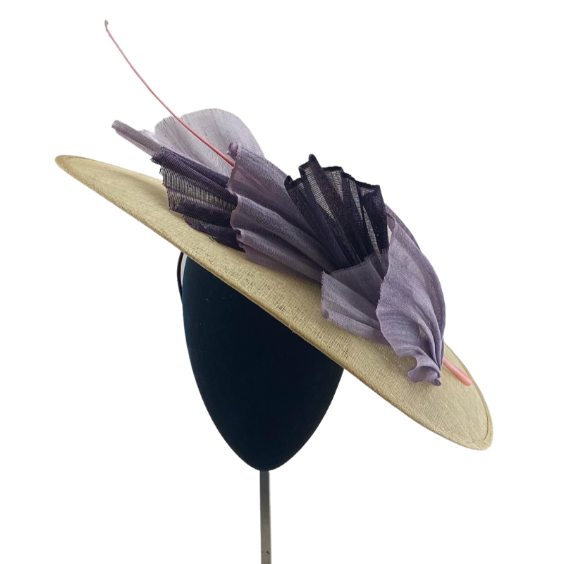 Pamela plato de sinamay natural con abanicos en malva y morado y raqui al tono