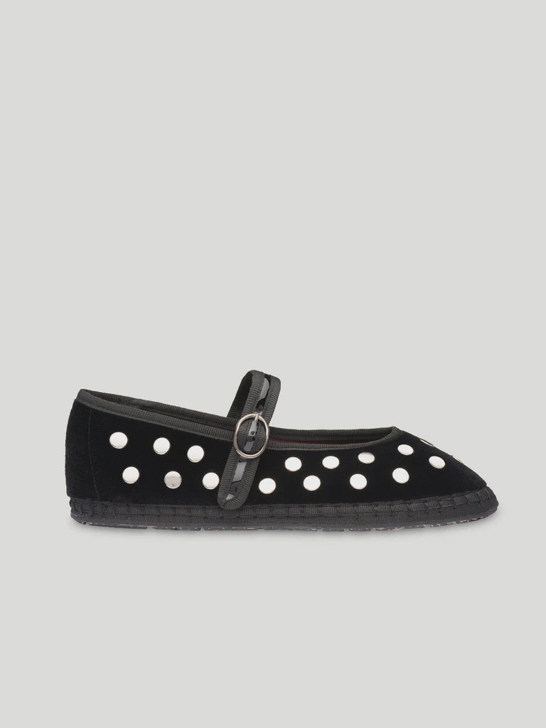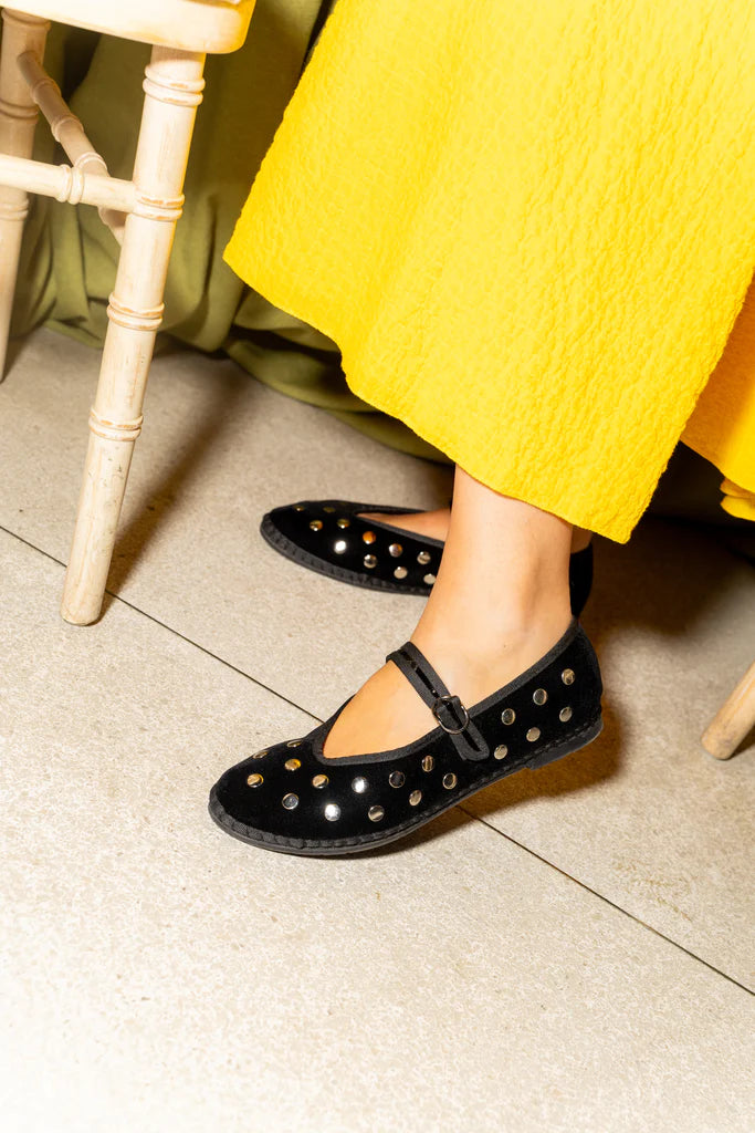 - Bailarina de terciopelo con escote en V en negro con ribetes negros y tachuelas plateadas.