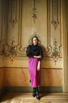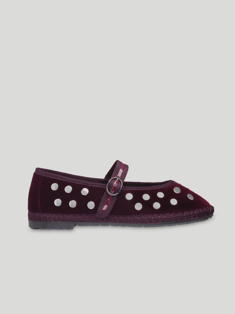 - Bailarina de terciopelo en pico en color burdeos con ribete burdeos y tachuelas plateadas.