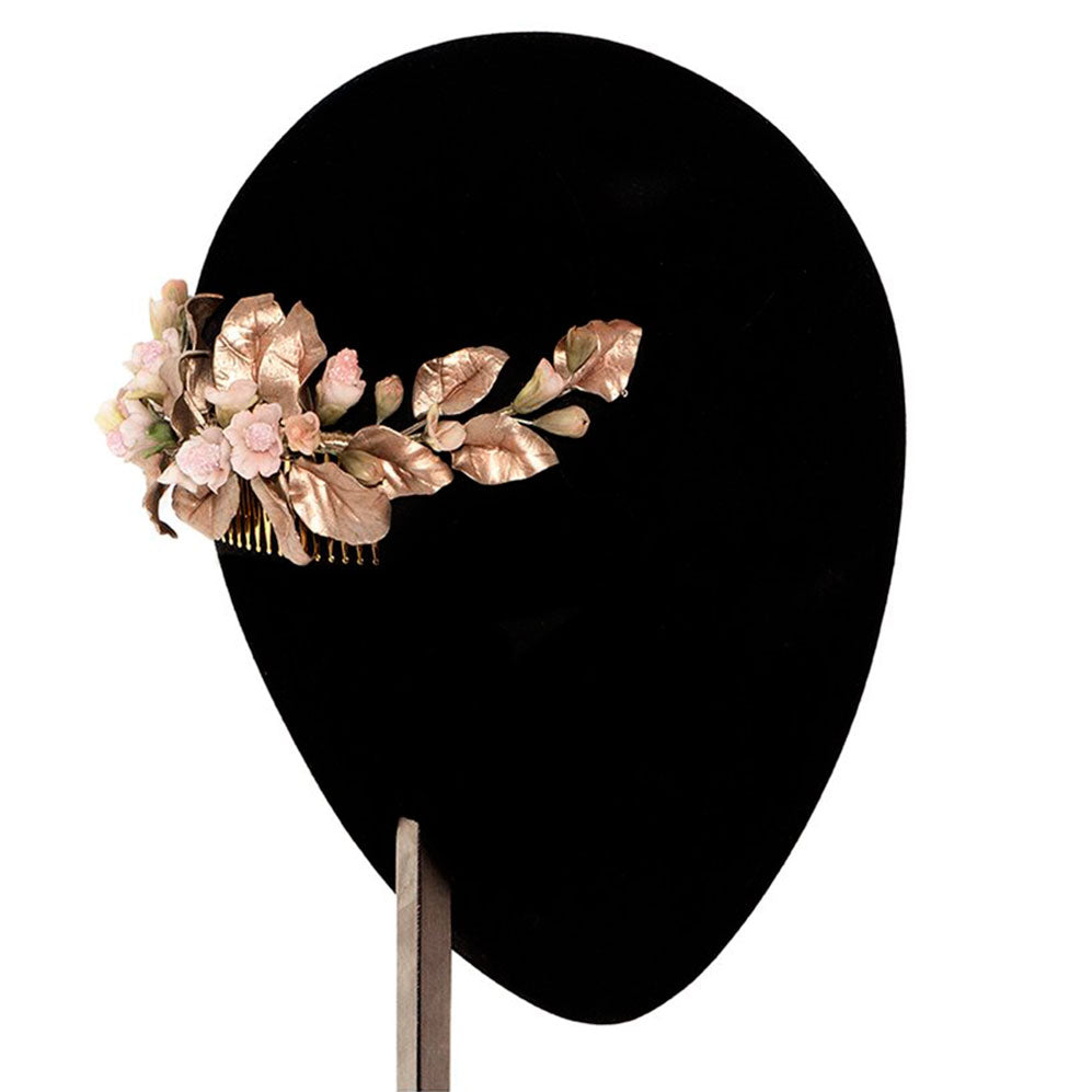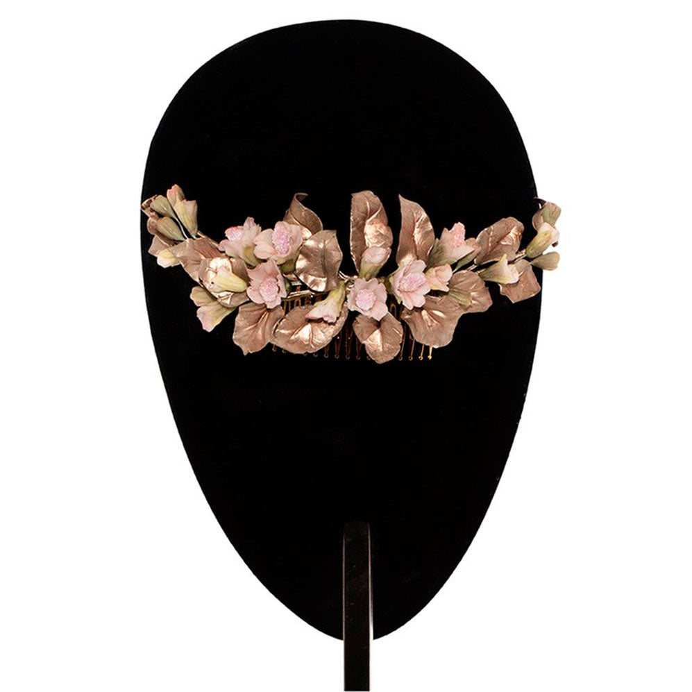 Floral comb and sheets of cold porcelain in shades of gold , Mauve and Green .
