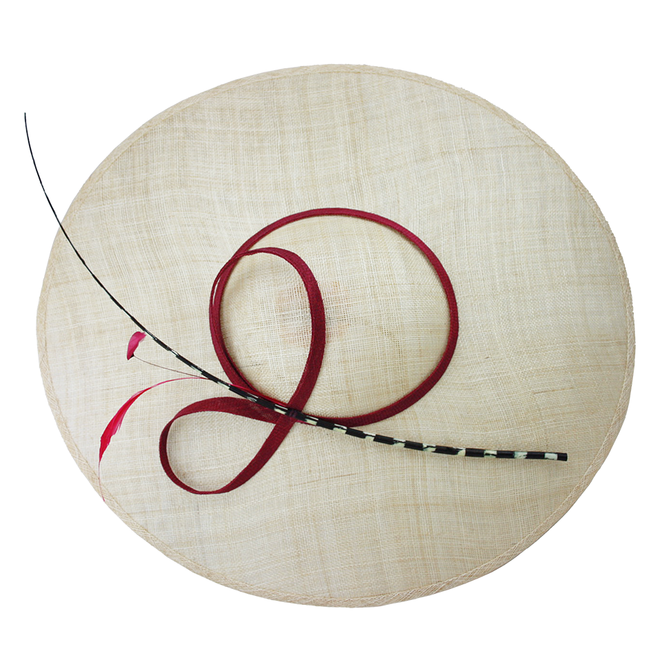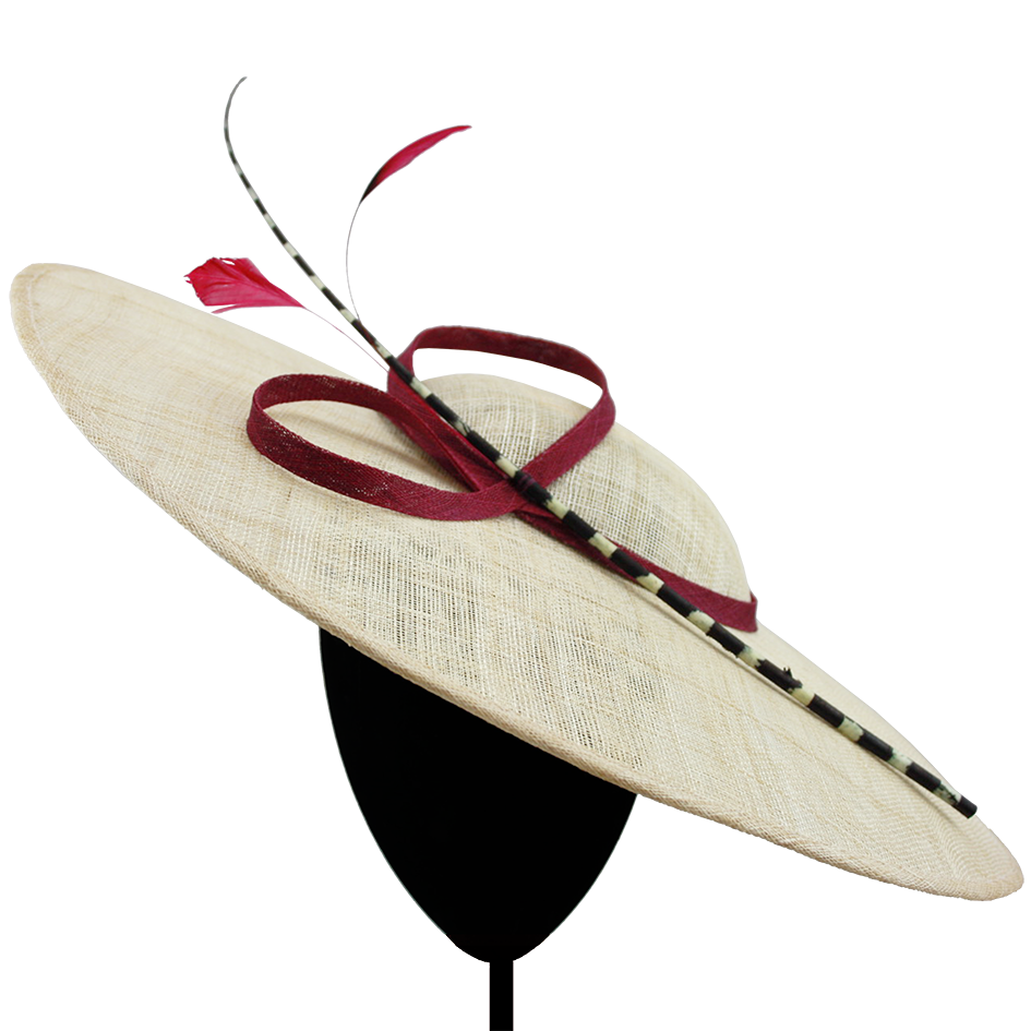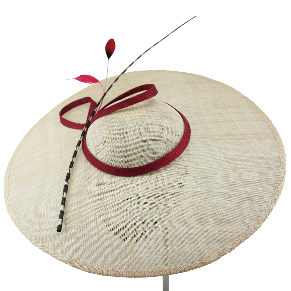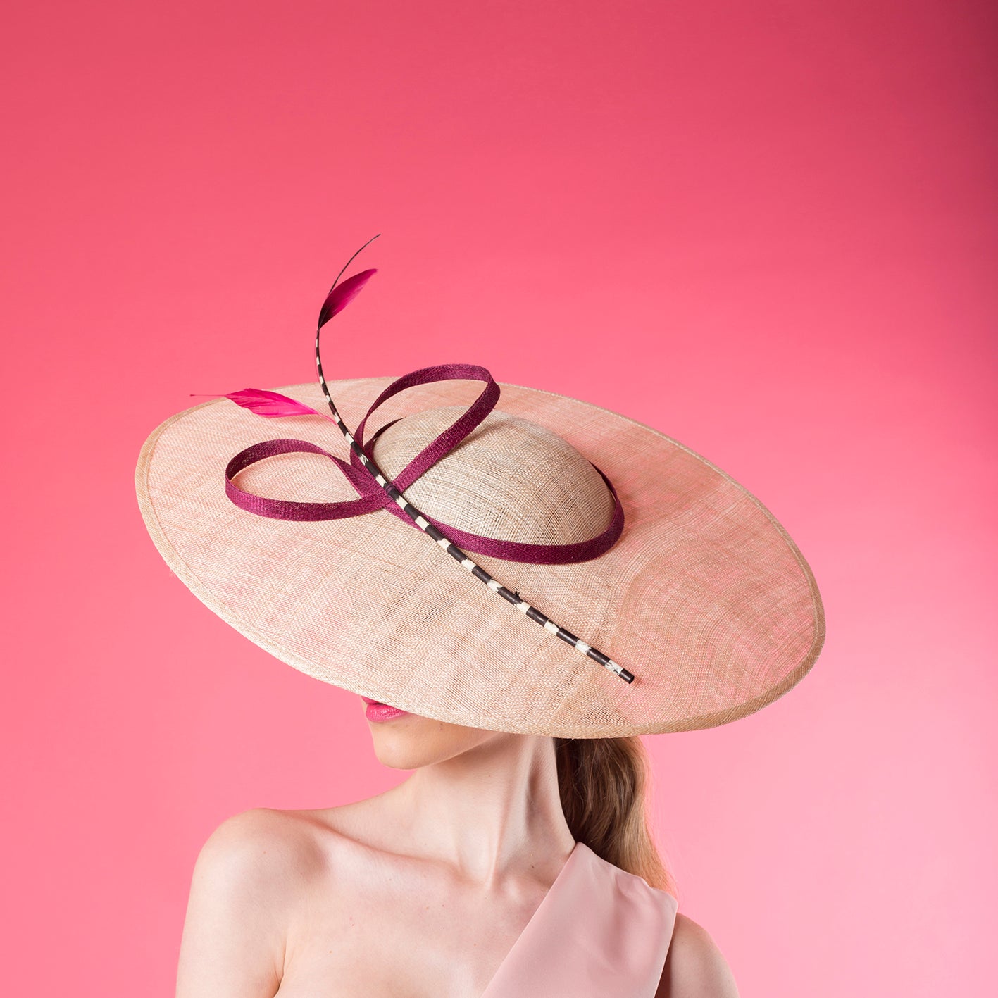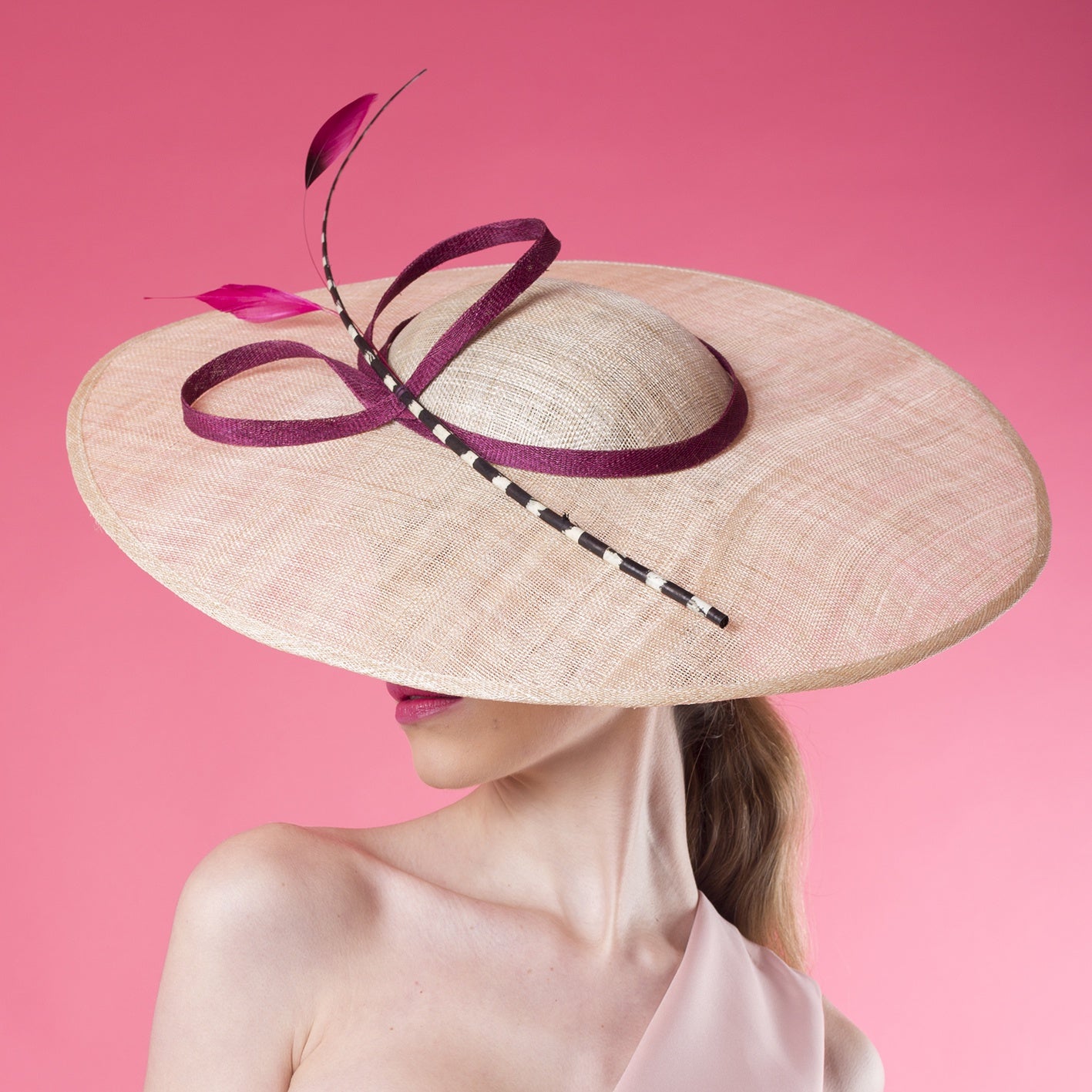 Dulcinea gigante en rafia natural con cinta y lazada de sinamay vino, raqui blanco y negro y 2 antenas fucsias
