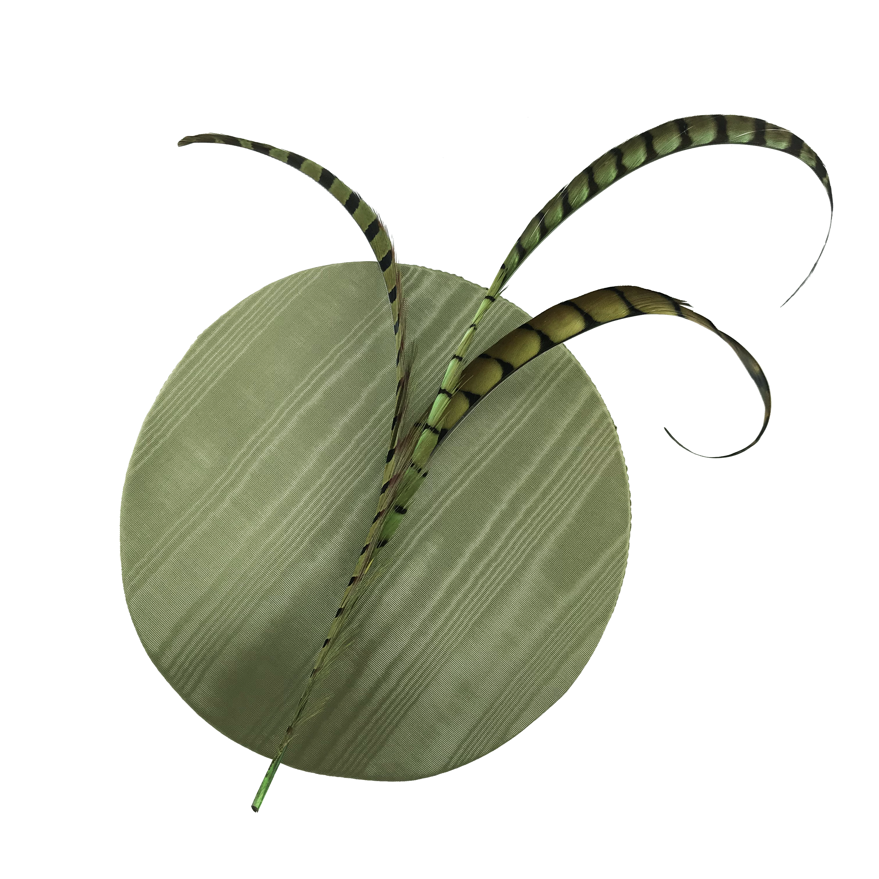 Dulcinea mini forrada en moire verde seco con plumas de faisán al tono.