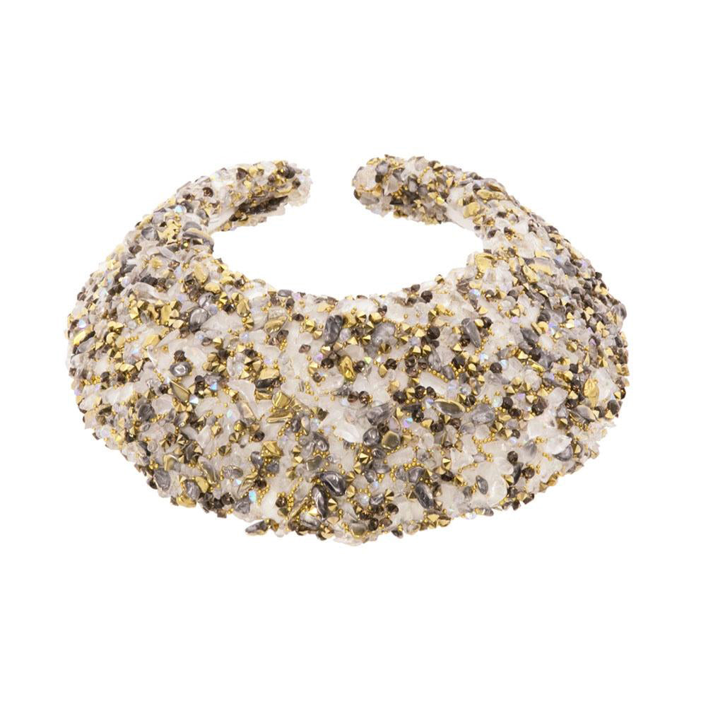 Estructura circular abierta con piedras y cristales brince, dorado y plata.