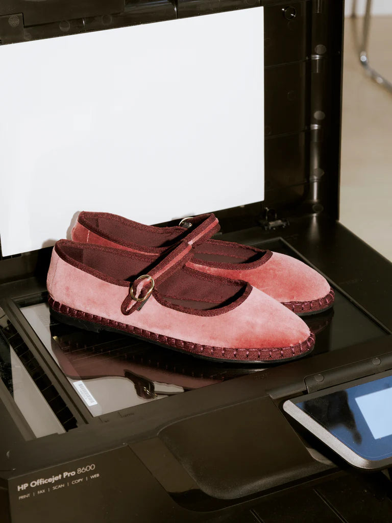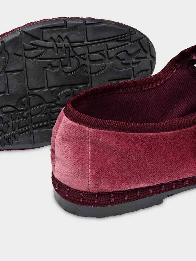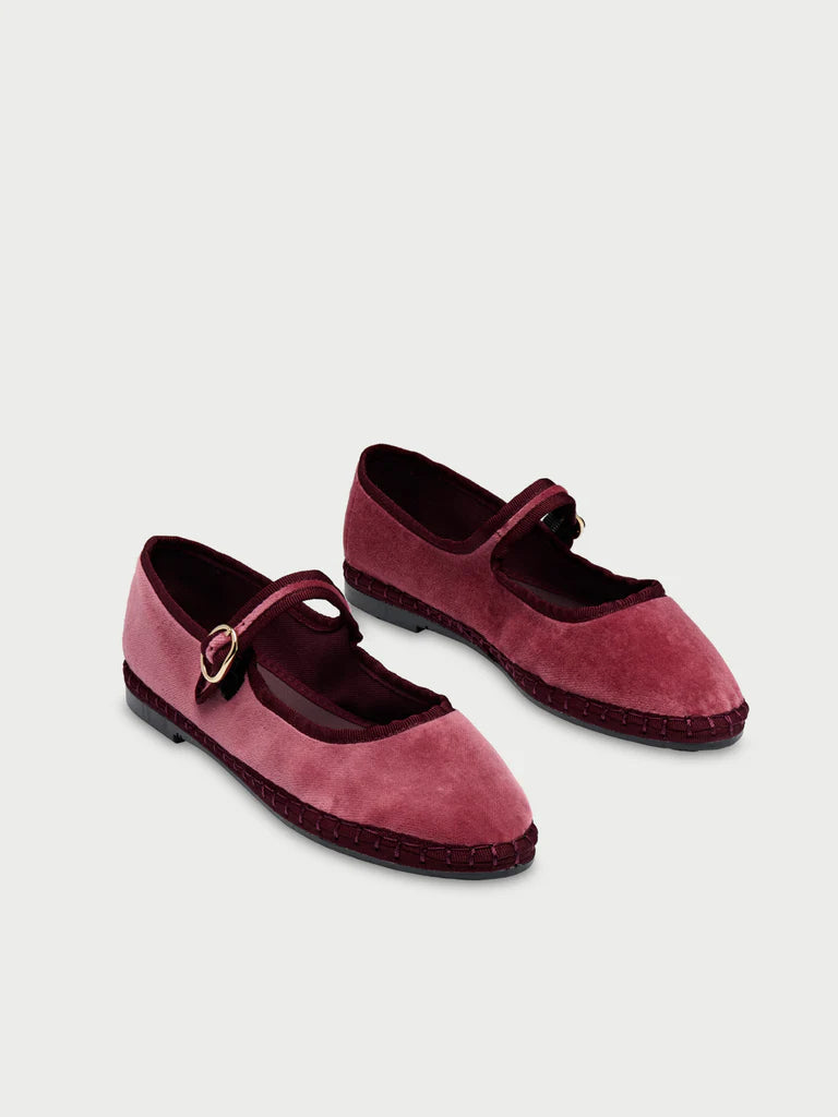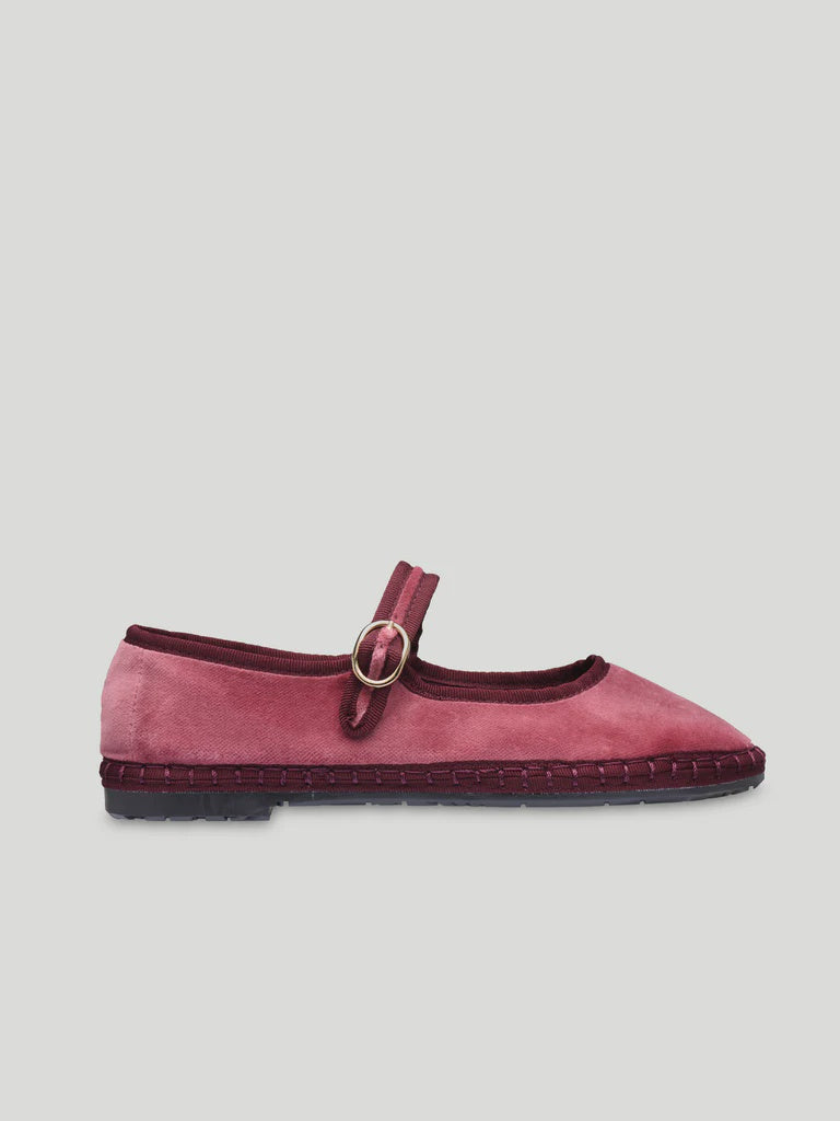 - Mary jane de terciopelo en rojo claro con ribete granate y cierre de hebilla.