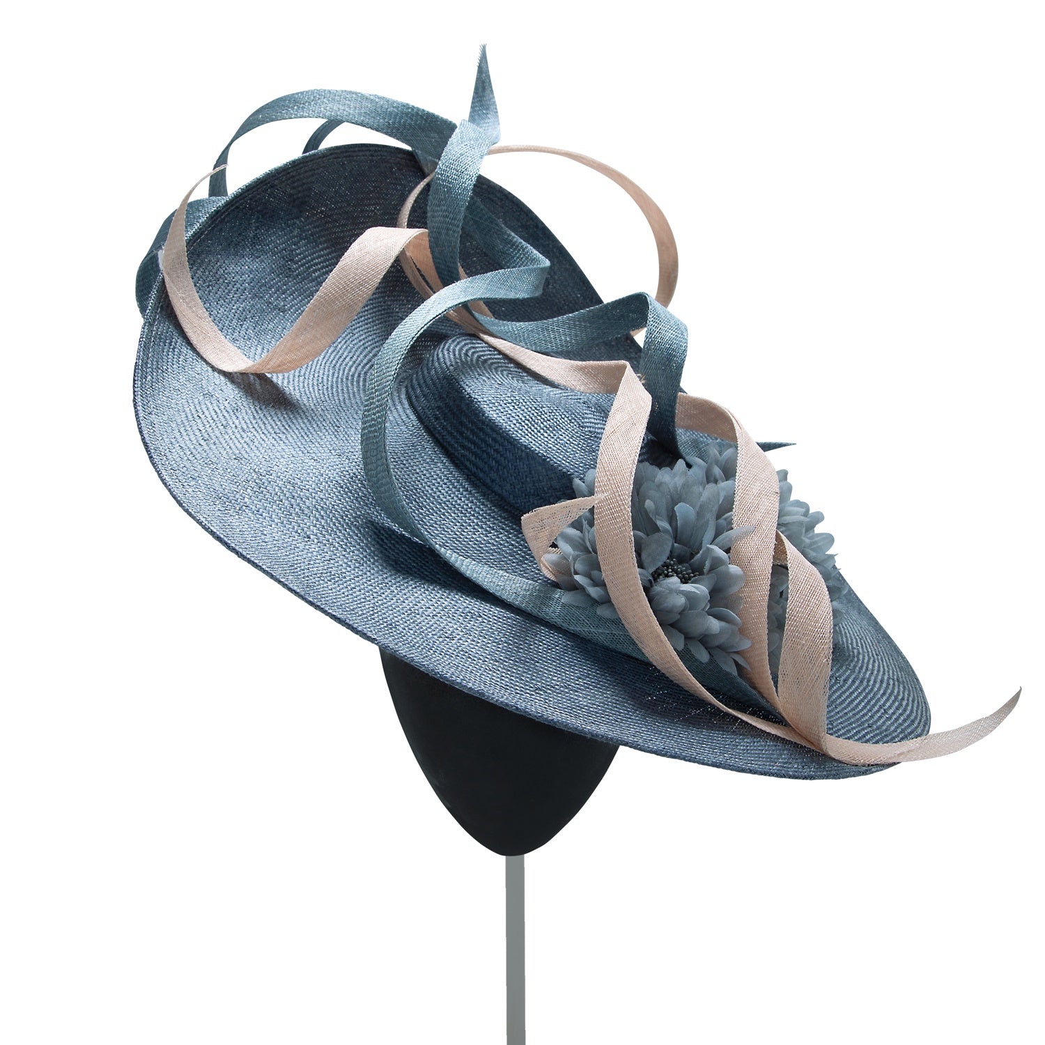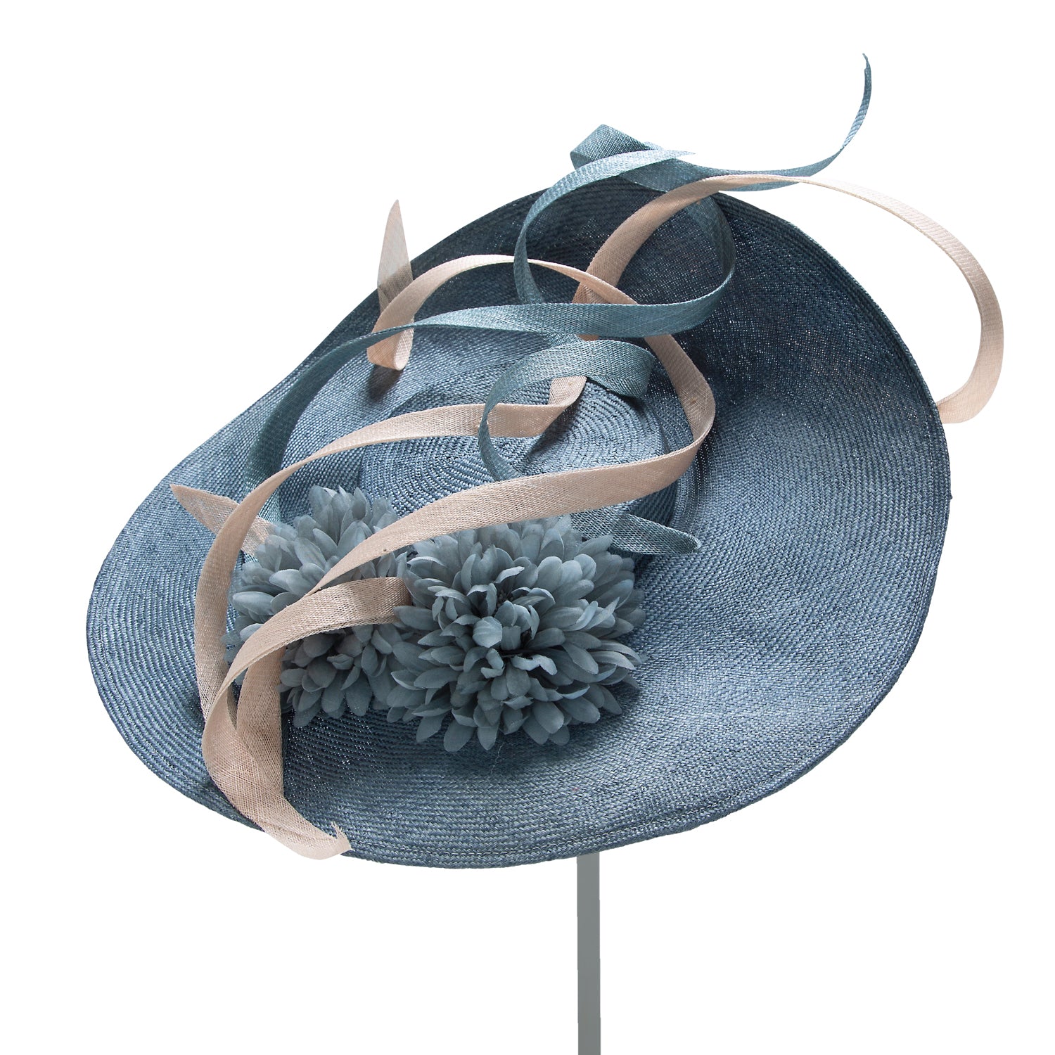 Dulcinea de parasisal azul grisáceo con ala levantado, ondas de sinamay rosa nude y azul y dos flores al tono