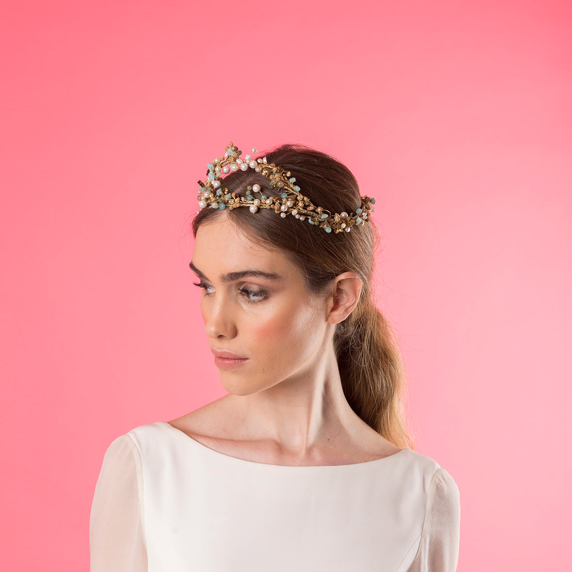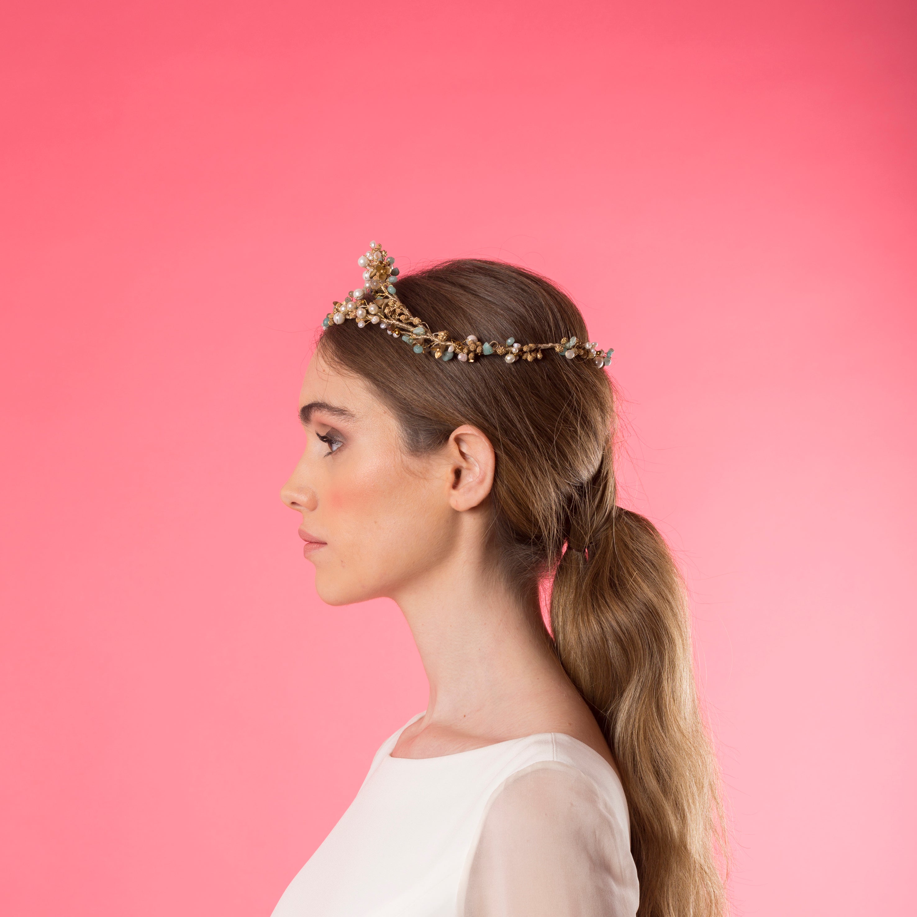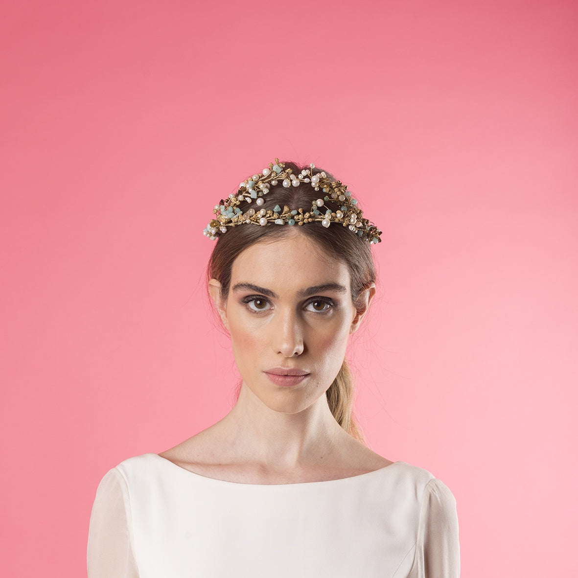 Corona doble de perlas, piedras turquesa y cobre y pistilos dorados.