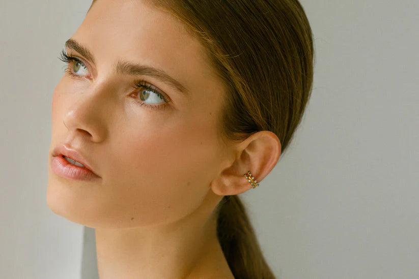 Air Cuff, pendiente individual, envuelve la oreja con un destello etéreo gracias a sus cristales engastados, sutilmente enmarcados en rodio, se elevan sobre una base de baño en oro de 24k. Su diseño abierto lo convierte en una pieza versátil y sin perforación, ideal para jugar con las alturas de la oreja y crear composiciones únicas.
