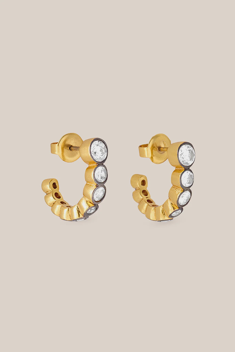 Los pendientes Delia destacan por su diseño de aro semicircular en latón con baño de oro de 24 k, que aporta un acabado cálido y sofisticado. Cada circonita está engastada en bisel y