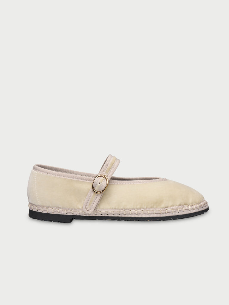 - Bailarina de terciopelo color crema con abertura en forma de V y ribete color crema.
