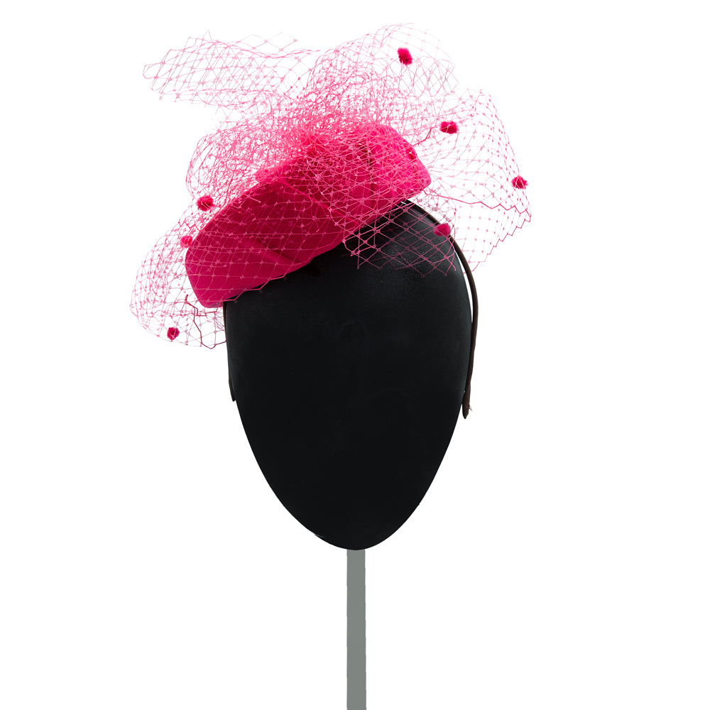 Casquete lágrima forrado en tejido fucsia con velo al tono con topitos y plumeti con volumen a la cara