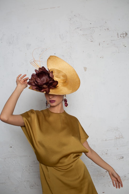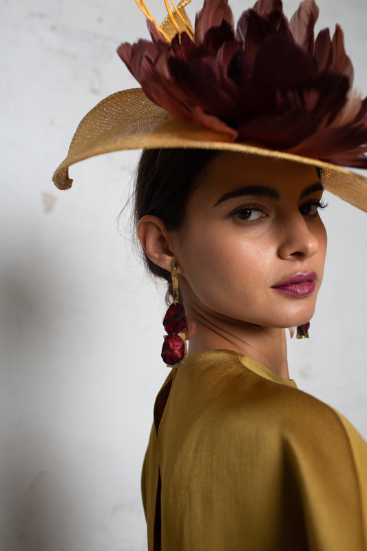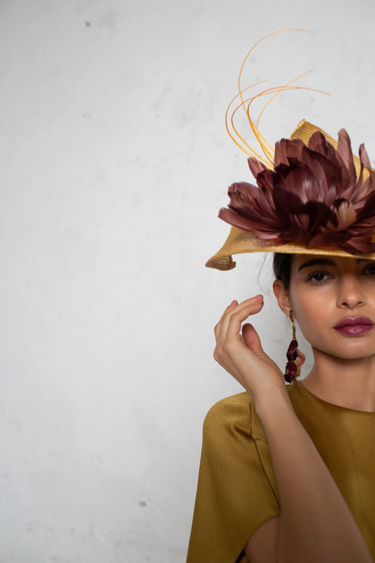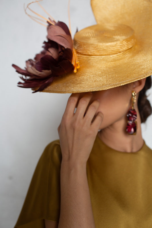 Ala levantada de parasisal amarillo con maxi flor de plumas burdeos y conjunto de raquis amarillos