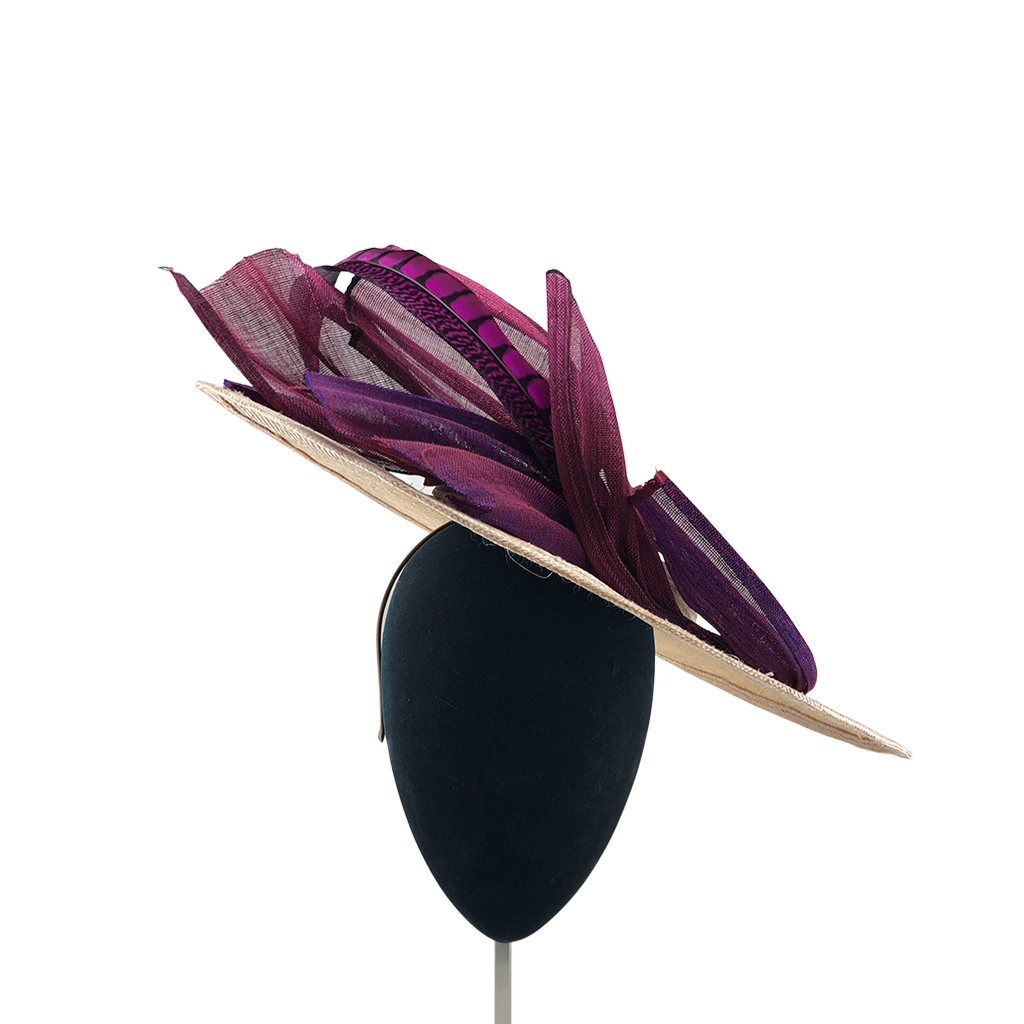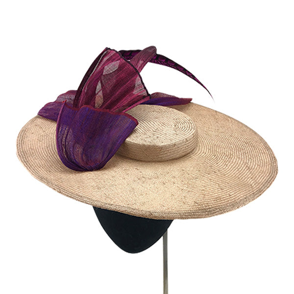 Pamela de parasisal tostado con abanicos de rafia buganvilla y morado y pluma de faisan