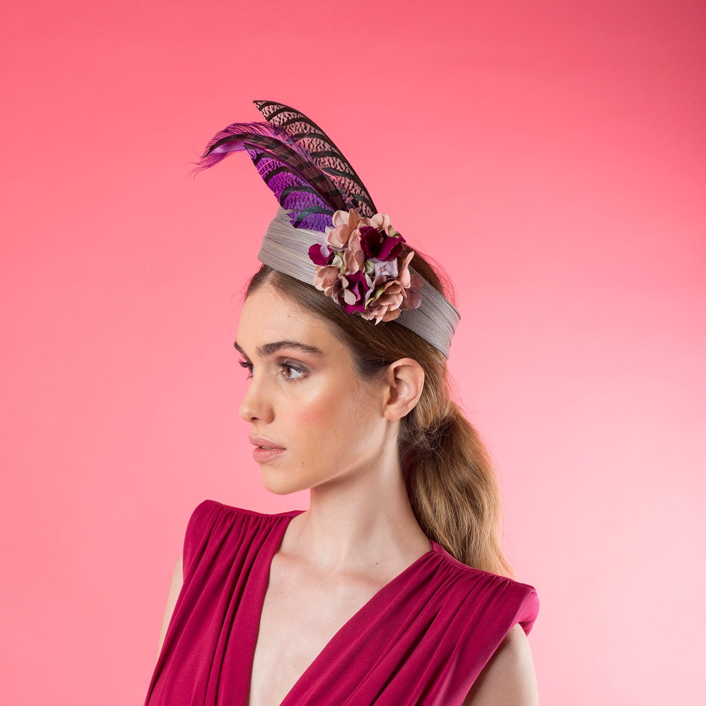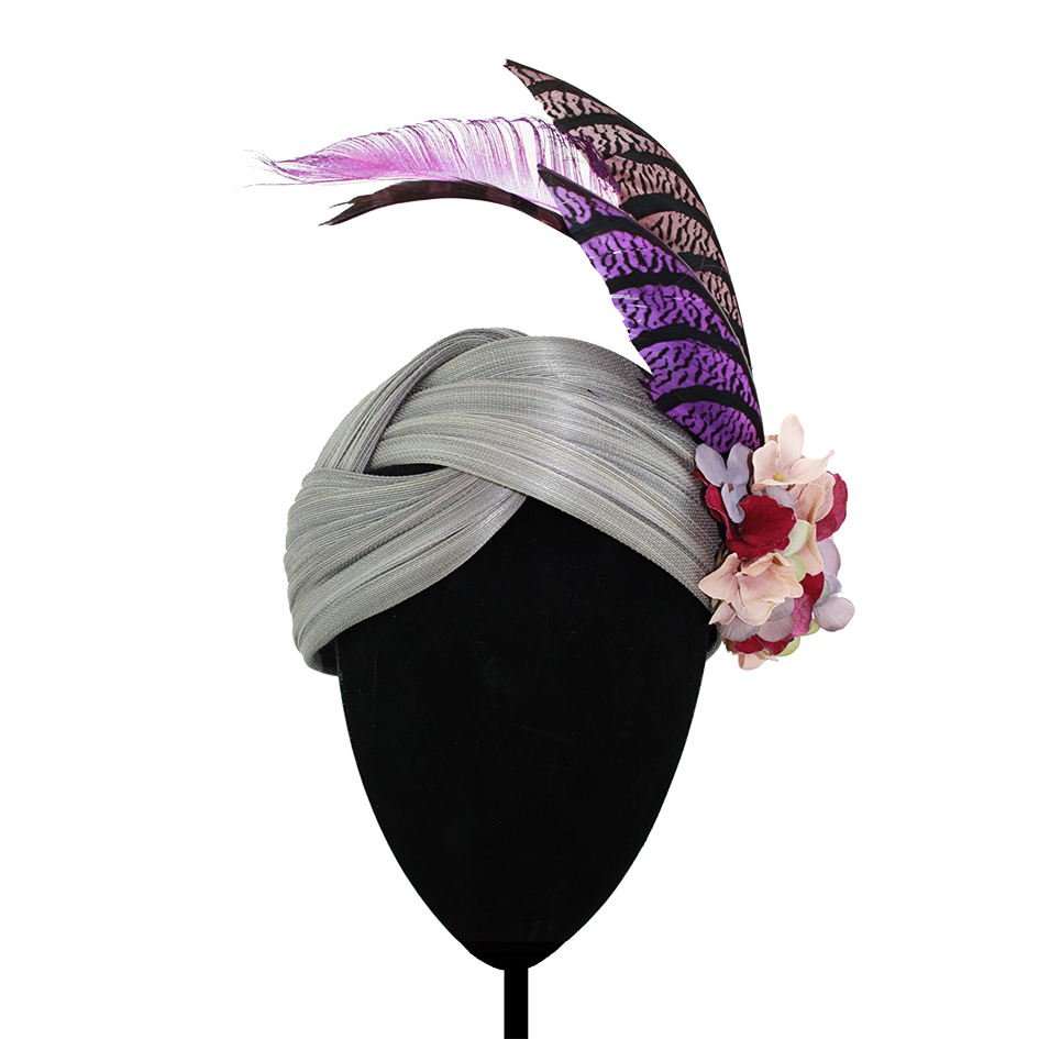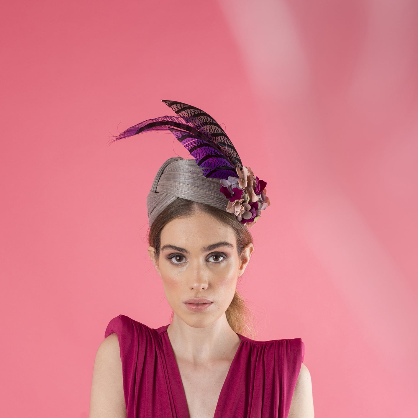 Gray raffia turban with flower garden in old Rose , Bougainvillea and mauve with two pheasant feathers .