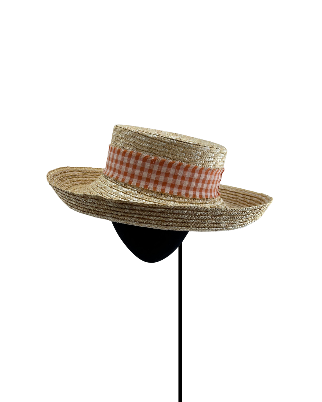 Sombrero de verano PICNIC pradera de paja natural, de ala levantada con cinta de algodón estampada de cuadros vichy naranjas. Ajustable.