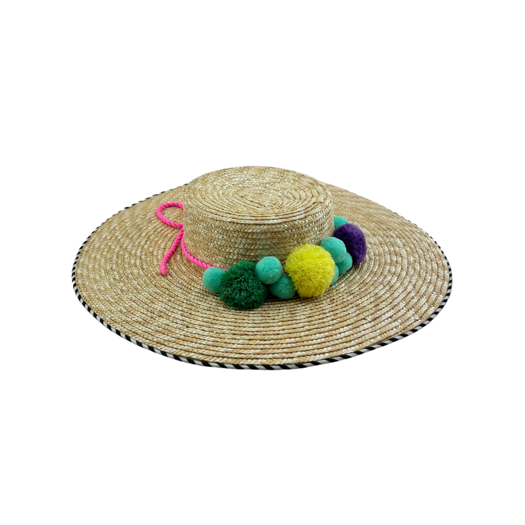 Sombrero de paja de copa cuadrada con pompones de colores y lazada de cordón rosa, con borde en el ala de cordón blanco y negro