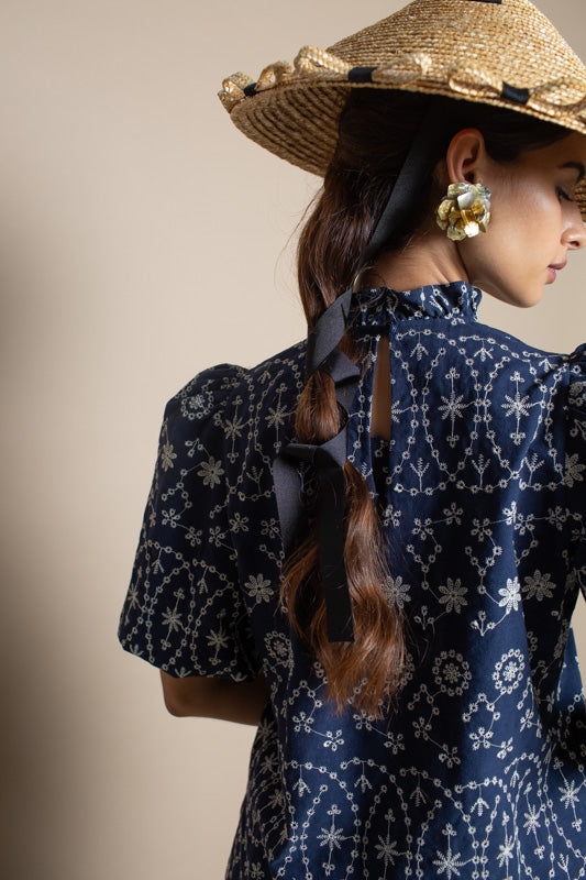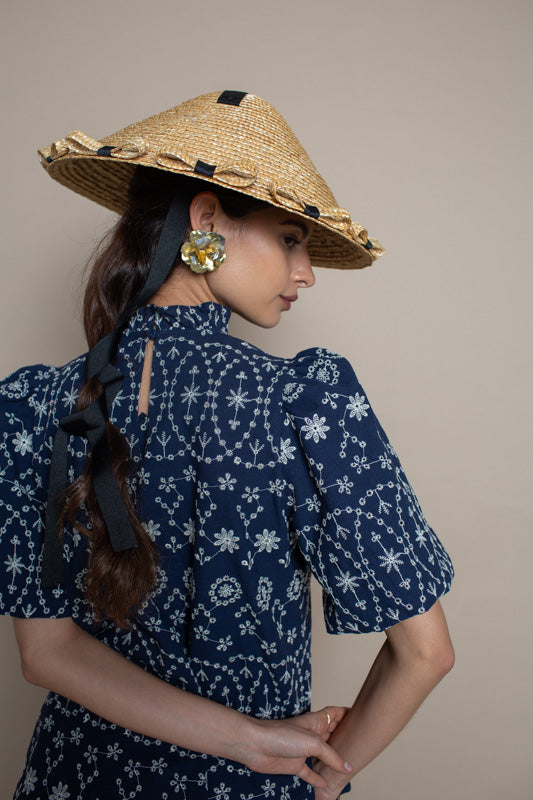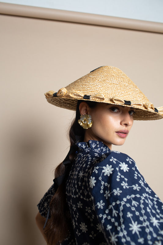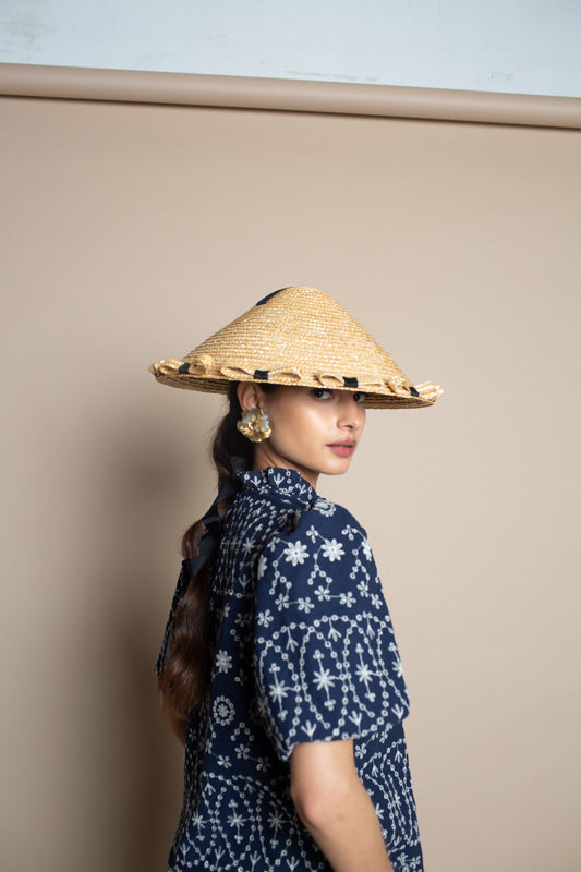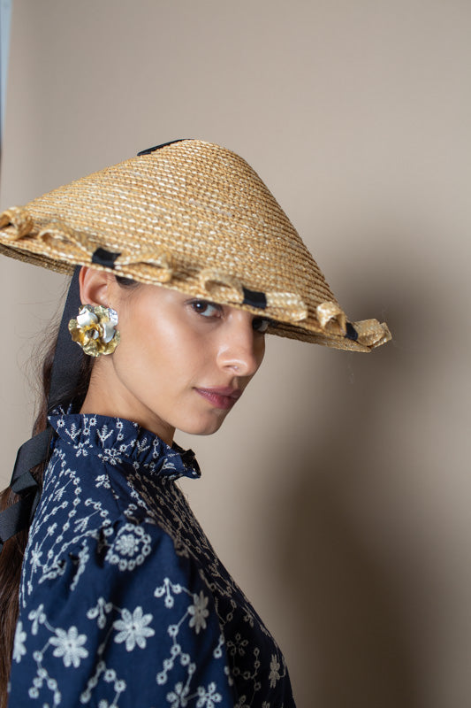 Sombrero tipo tailandés de paja natural con lacitos alrededor y con cinta negra para atar al cuello