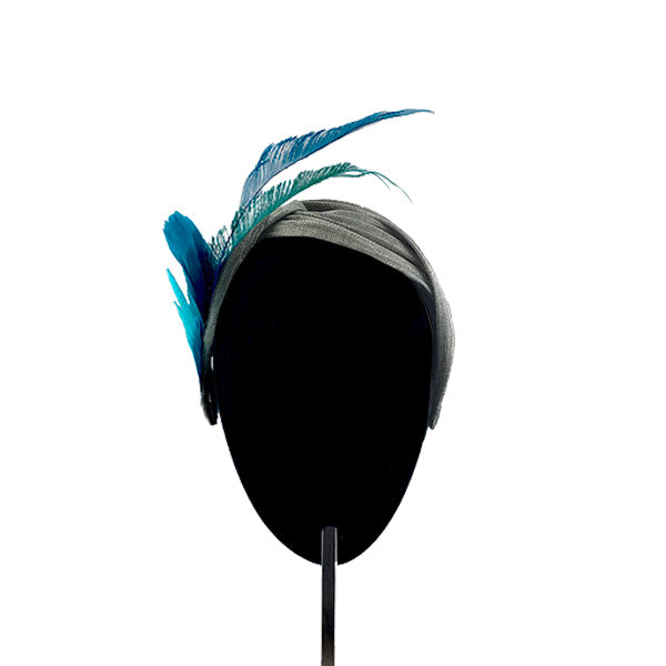 Diadema de rafia de algodón cruzada en tono grisáceo con plumas en tonos azules