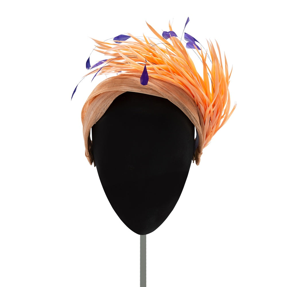 Diadema turbante de rafia de seda naranja con plumas sierra naranjas y antenas moradas