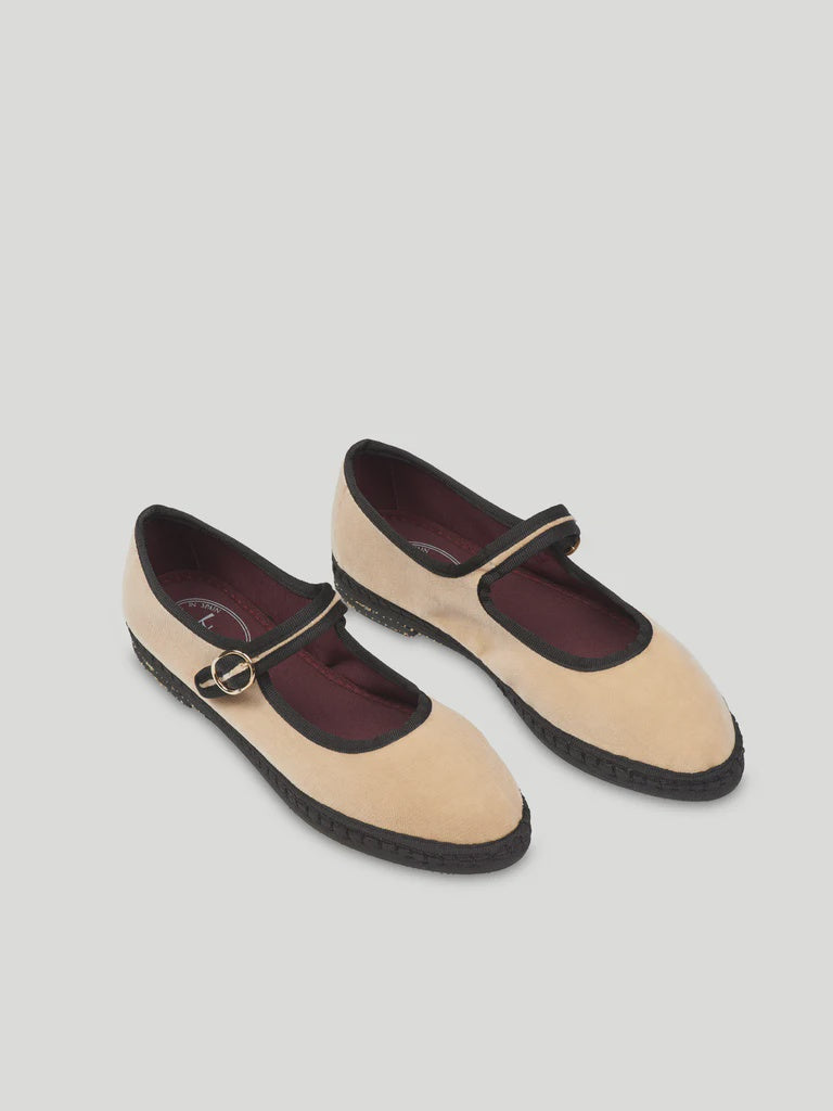 - Mercedita de terciopelo en color beige con ribetes negros y cierre de hebilla.