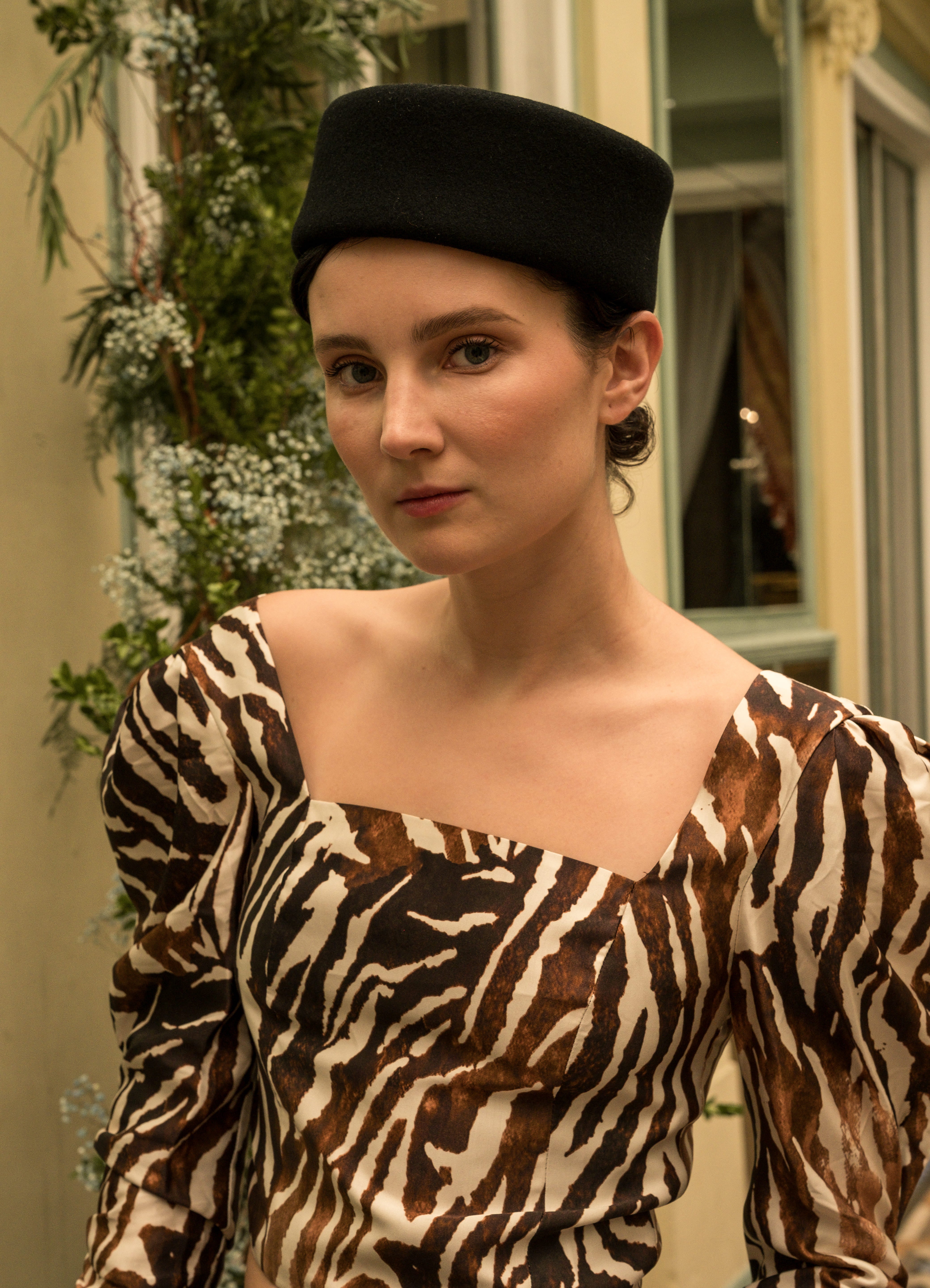 Top estampado con escote cuadrado y manga abullonada.