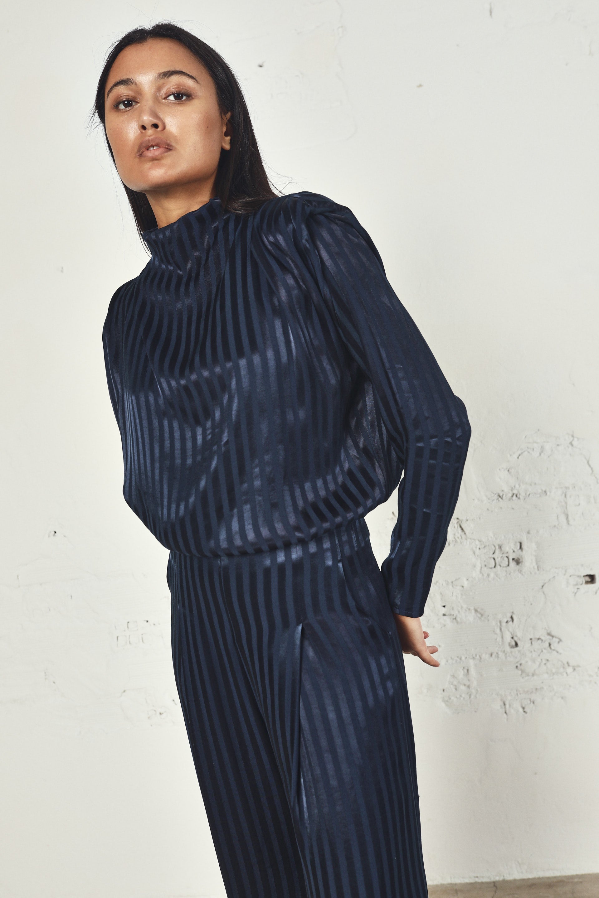Camisa de manga larga con hombreras y cuello perkins.