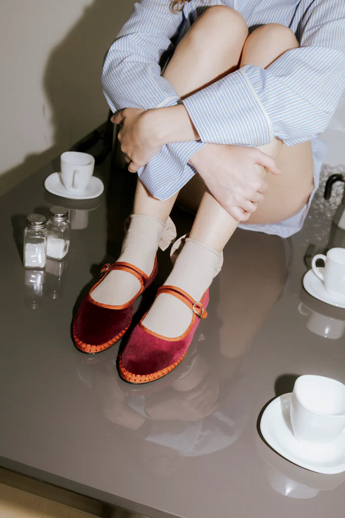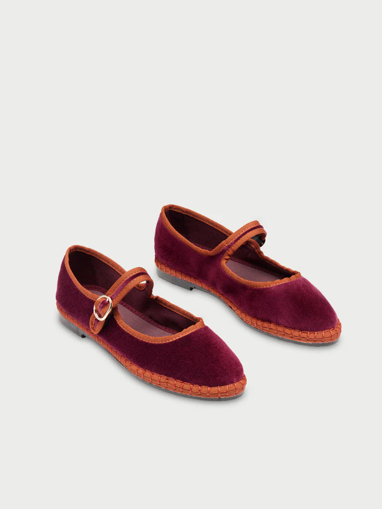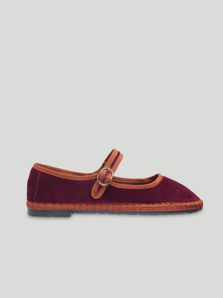 - Mary jane de terciopelo en burdeos con ribete naranja oscuro y cierre de hebilla.