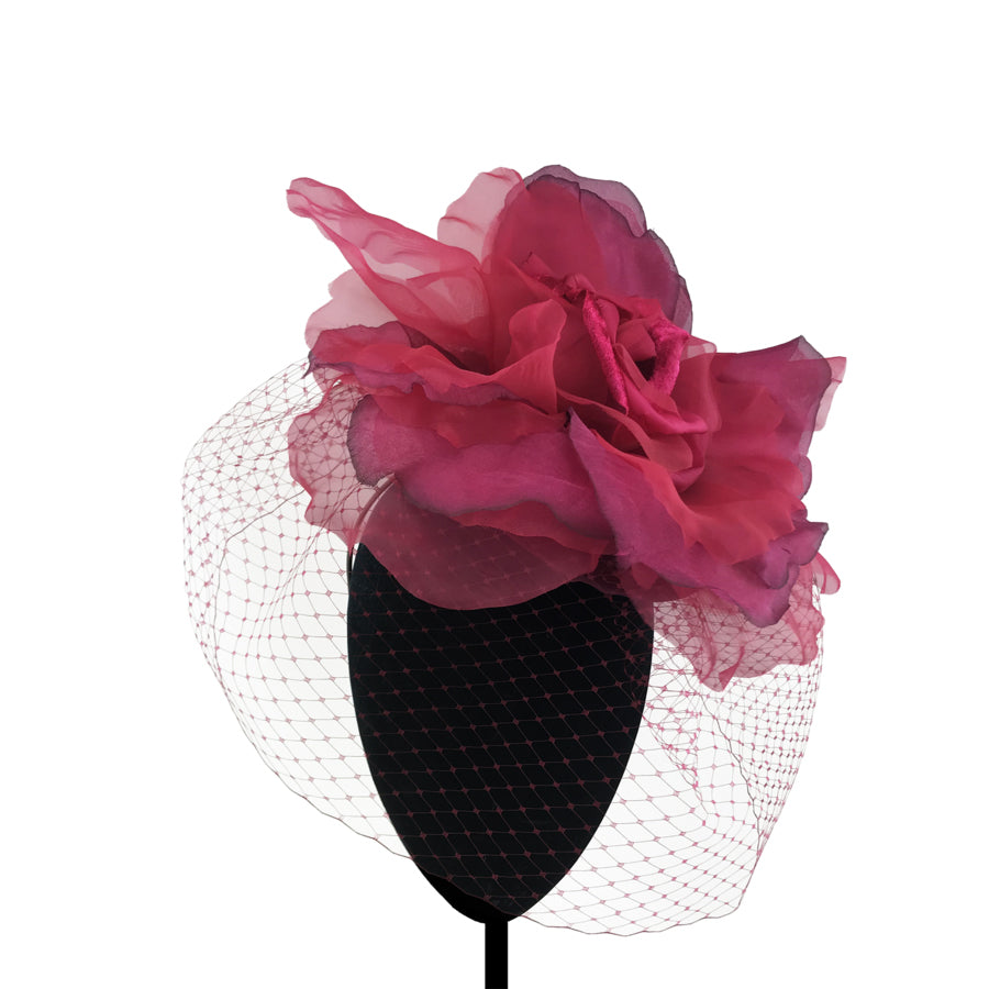Flor XL montada en casquete en pico forrado en tela burdeos con redecilla al tono.