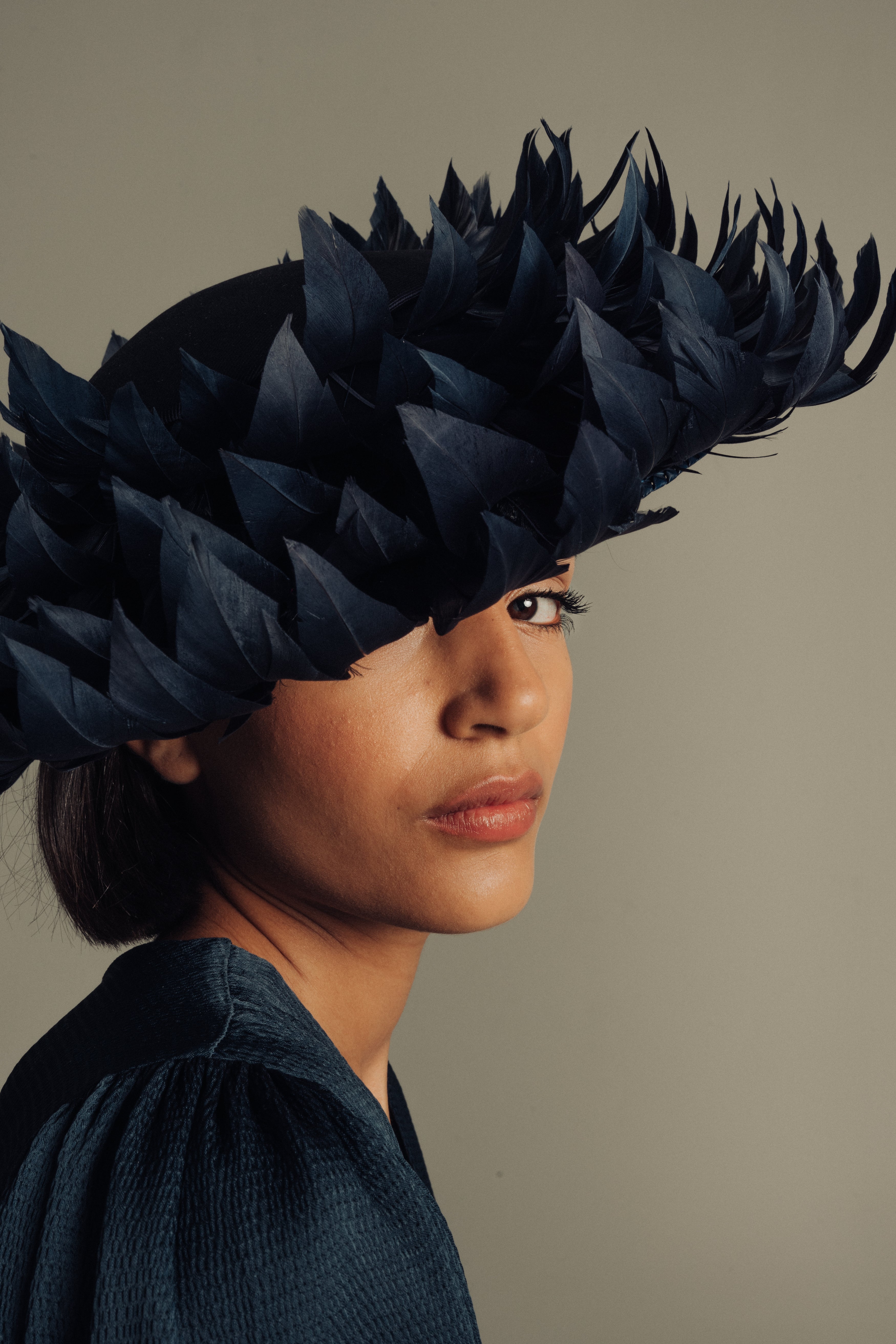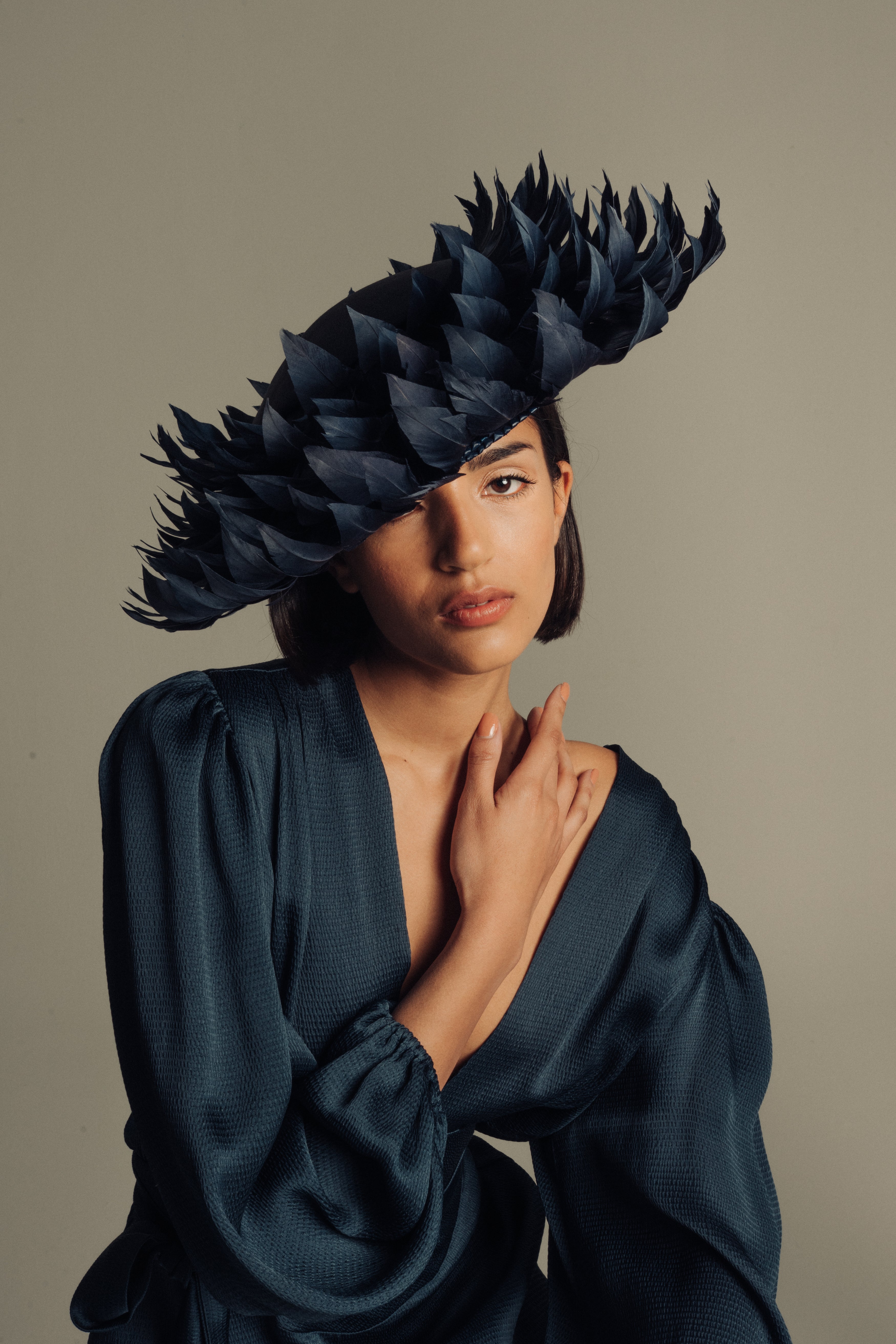 Maxi cuenco de paja azul marino con copa de crepe y ala de plumas en pico al tono.