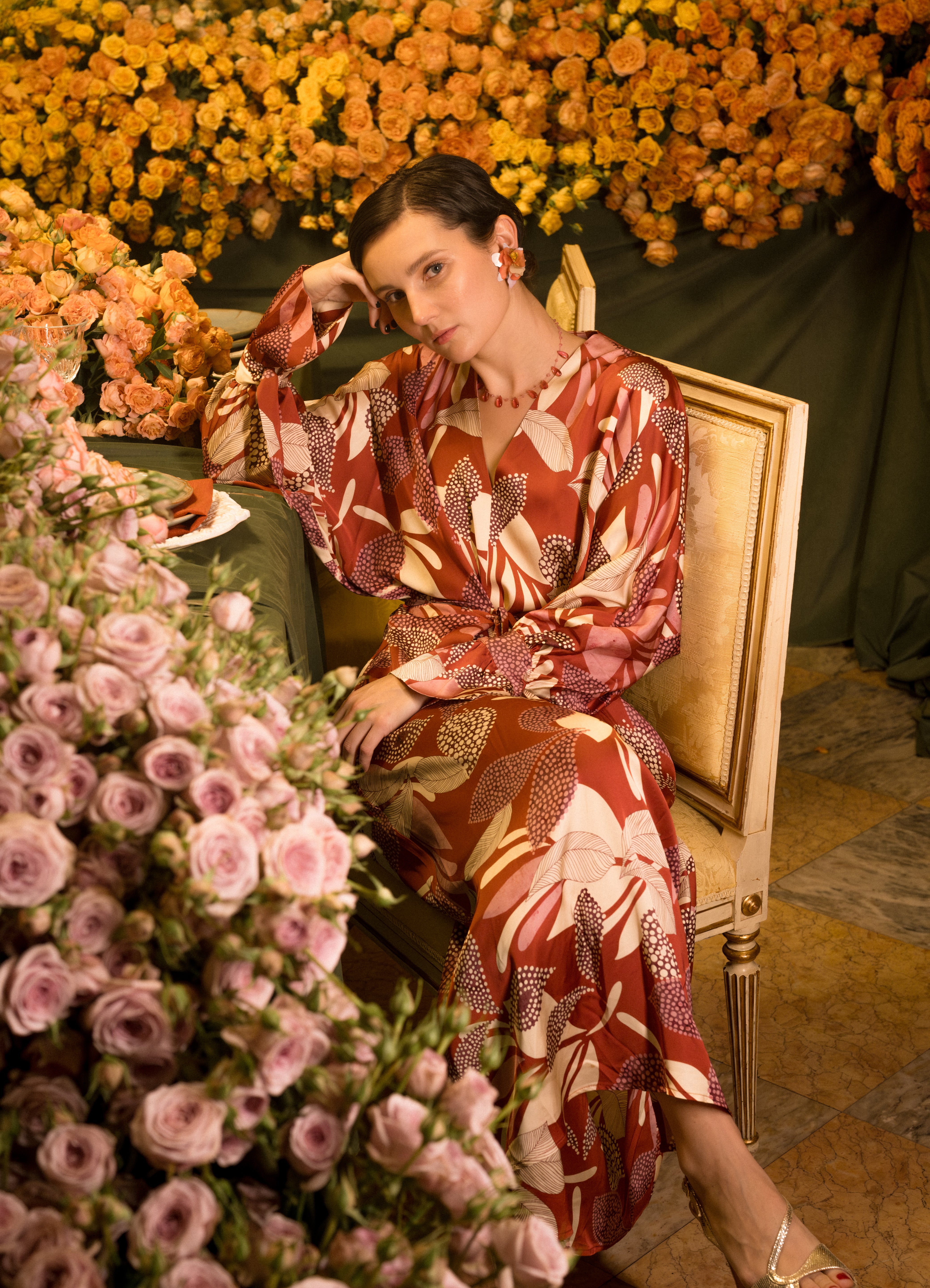 Vestido midi de manga larga de estilo japonés con escote en V estampado.