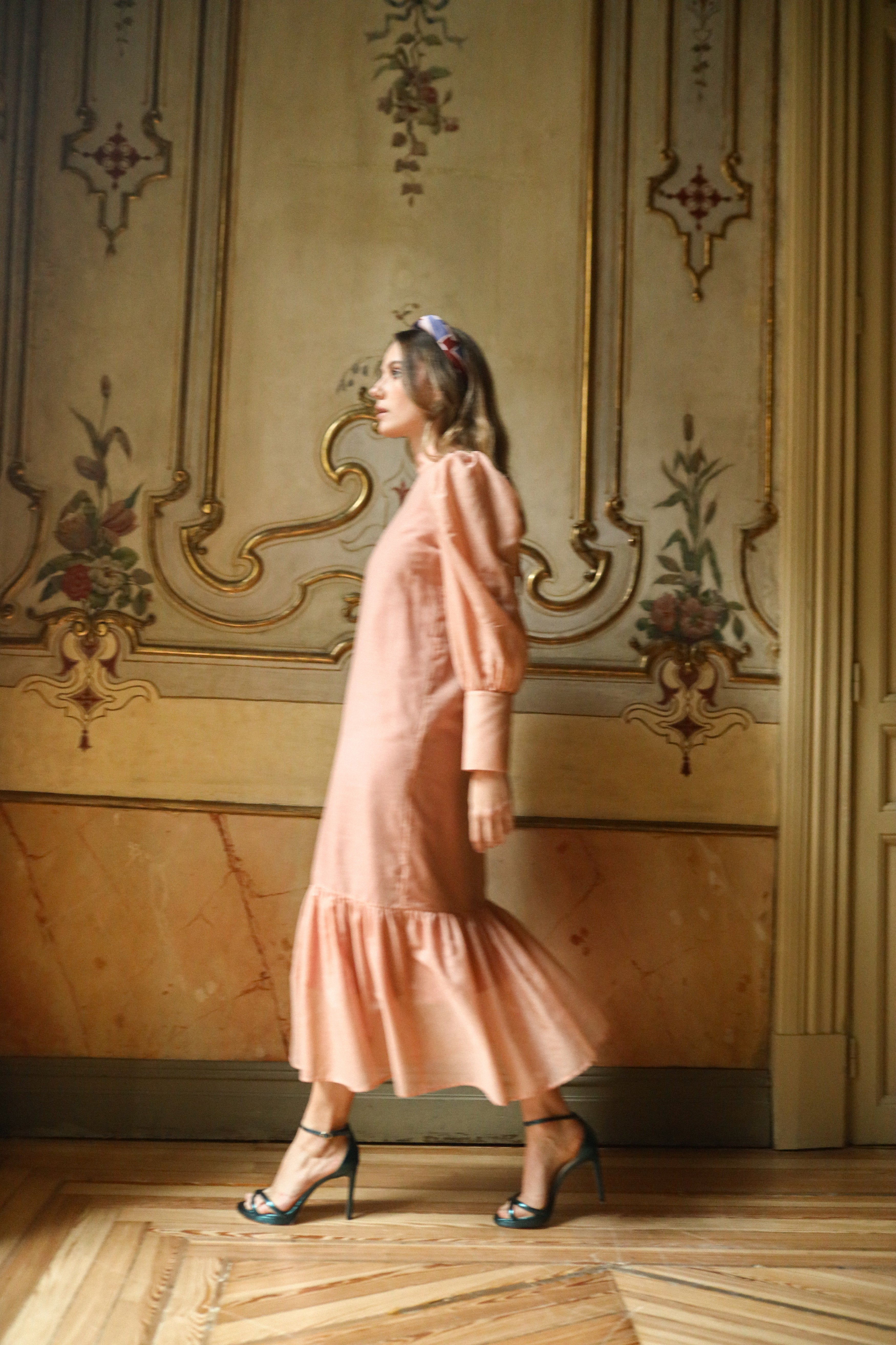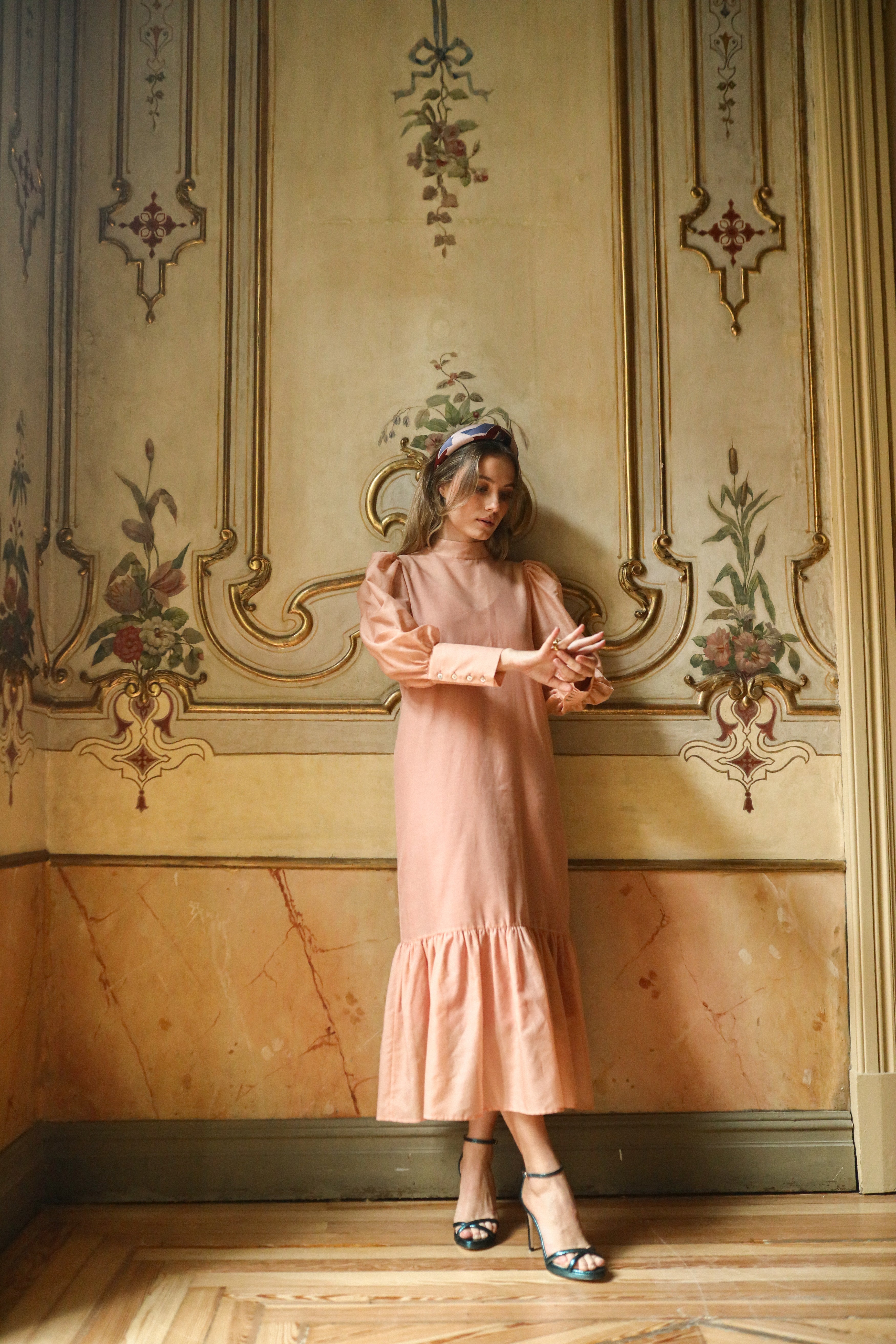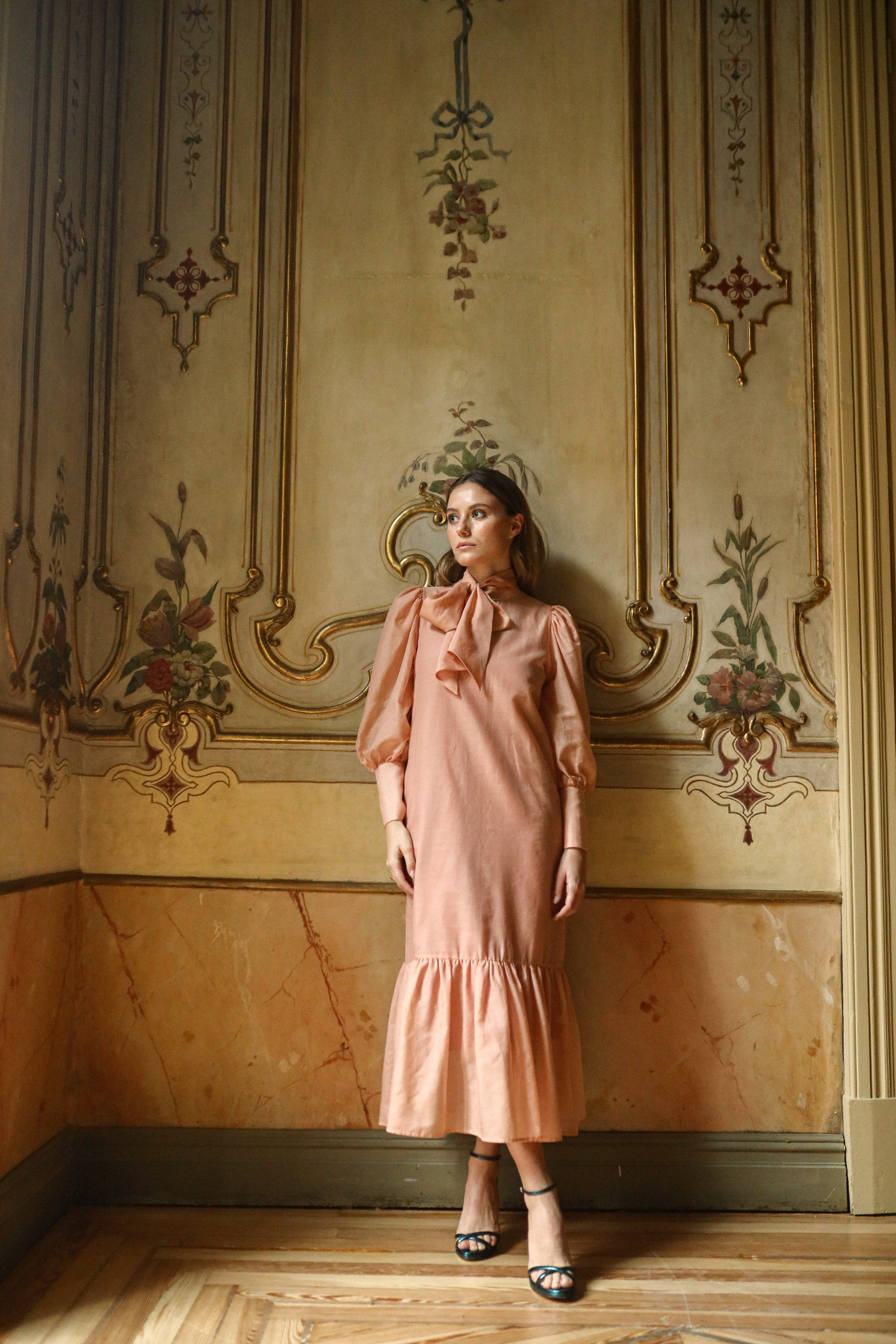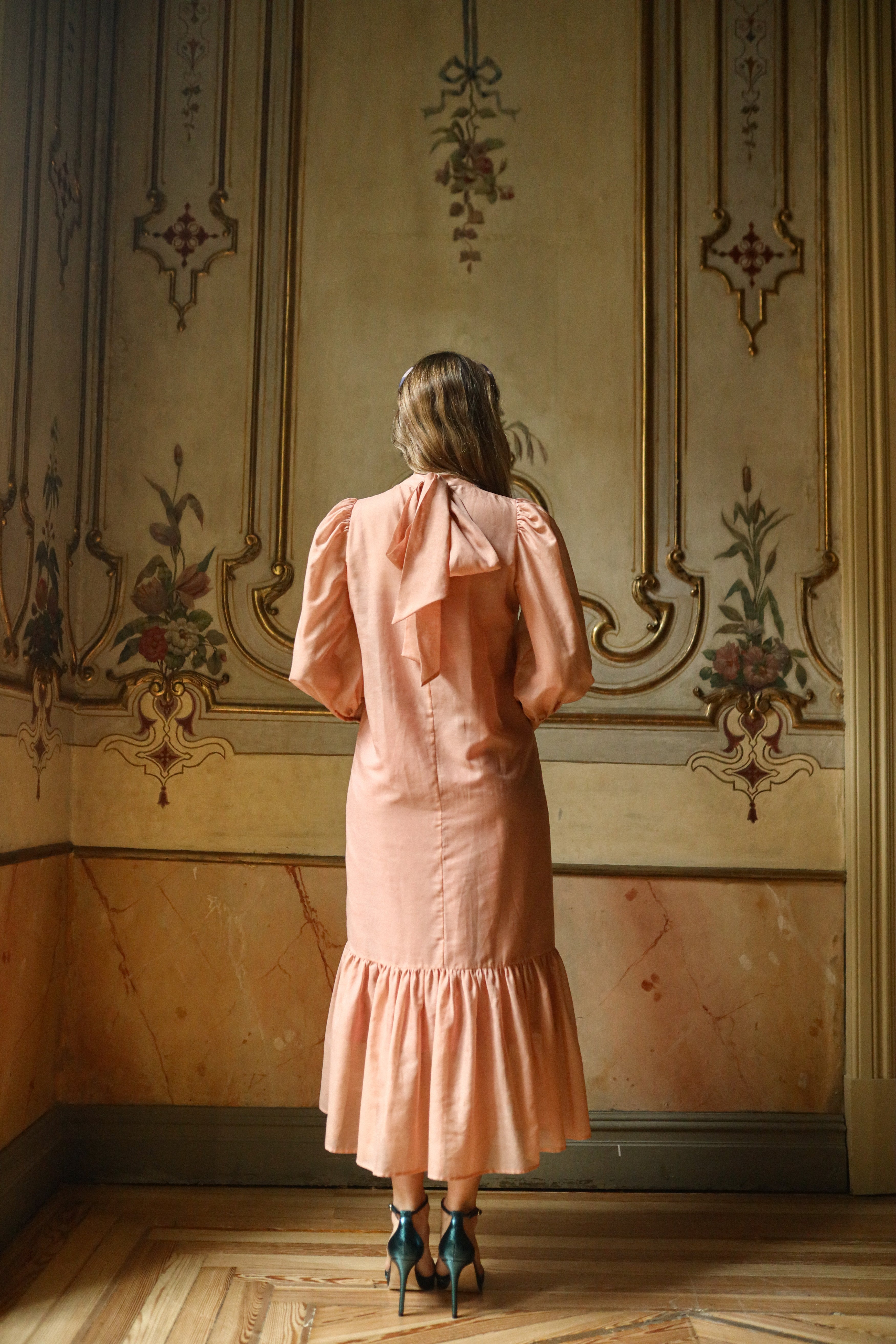 Vestido midi con volante, puños y lazada al cuello.