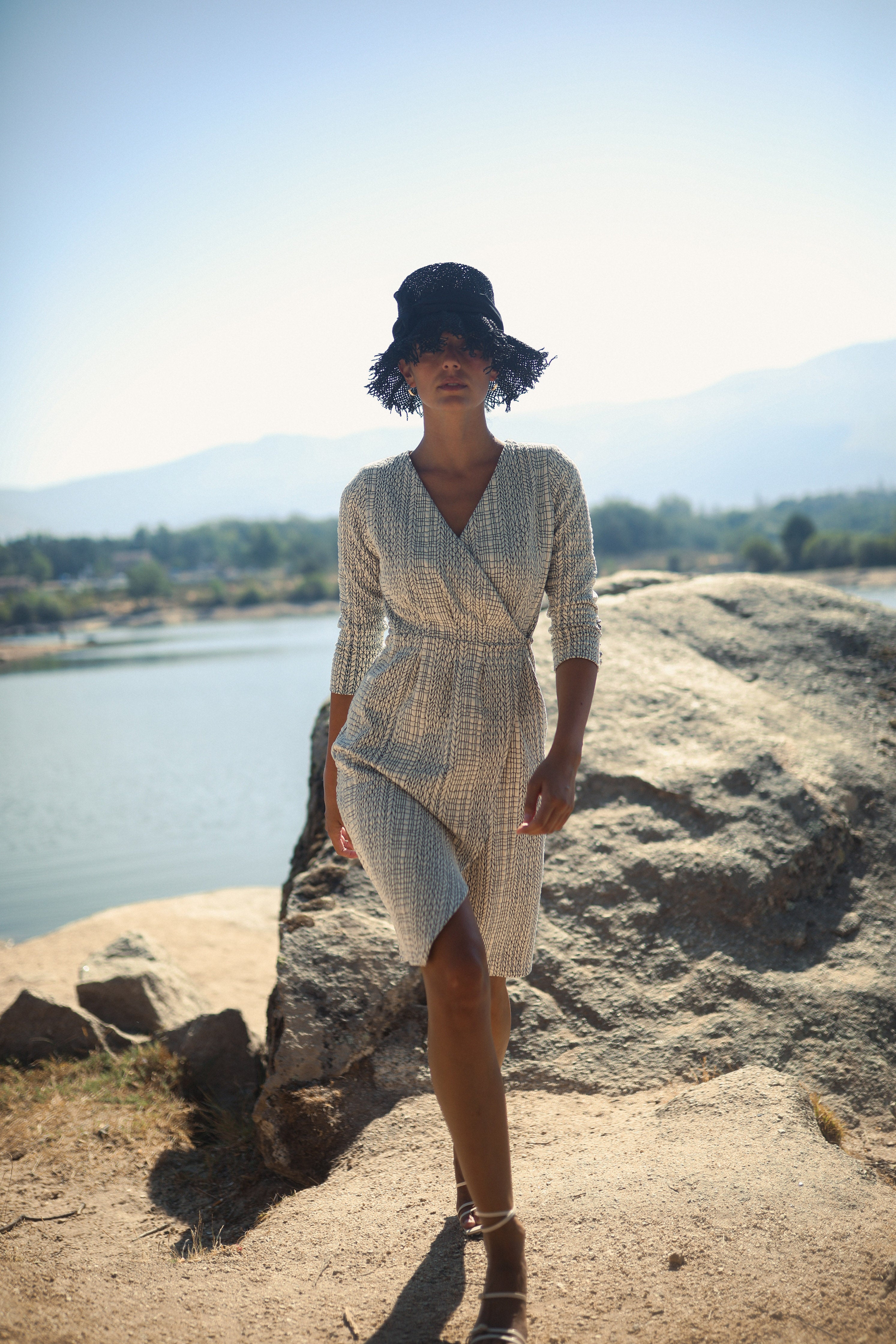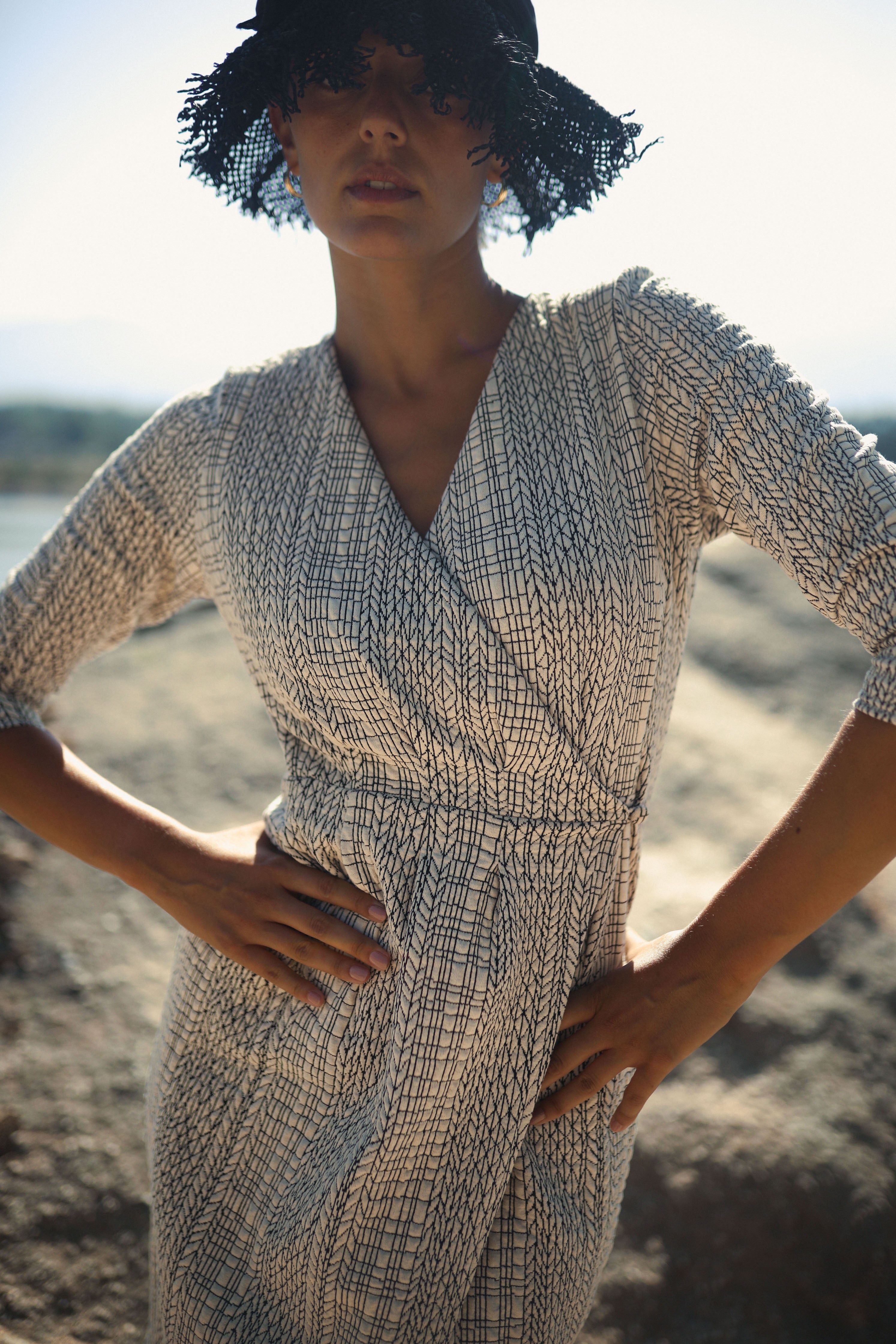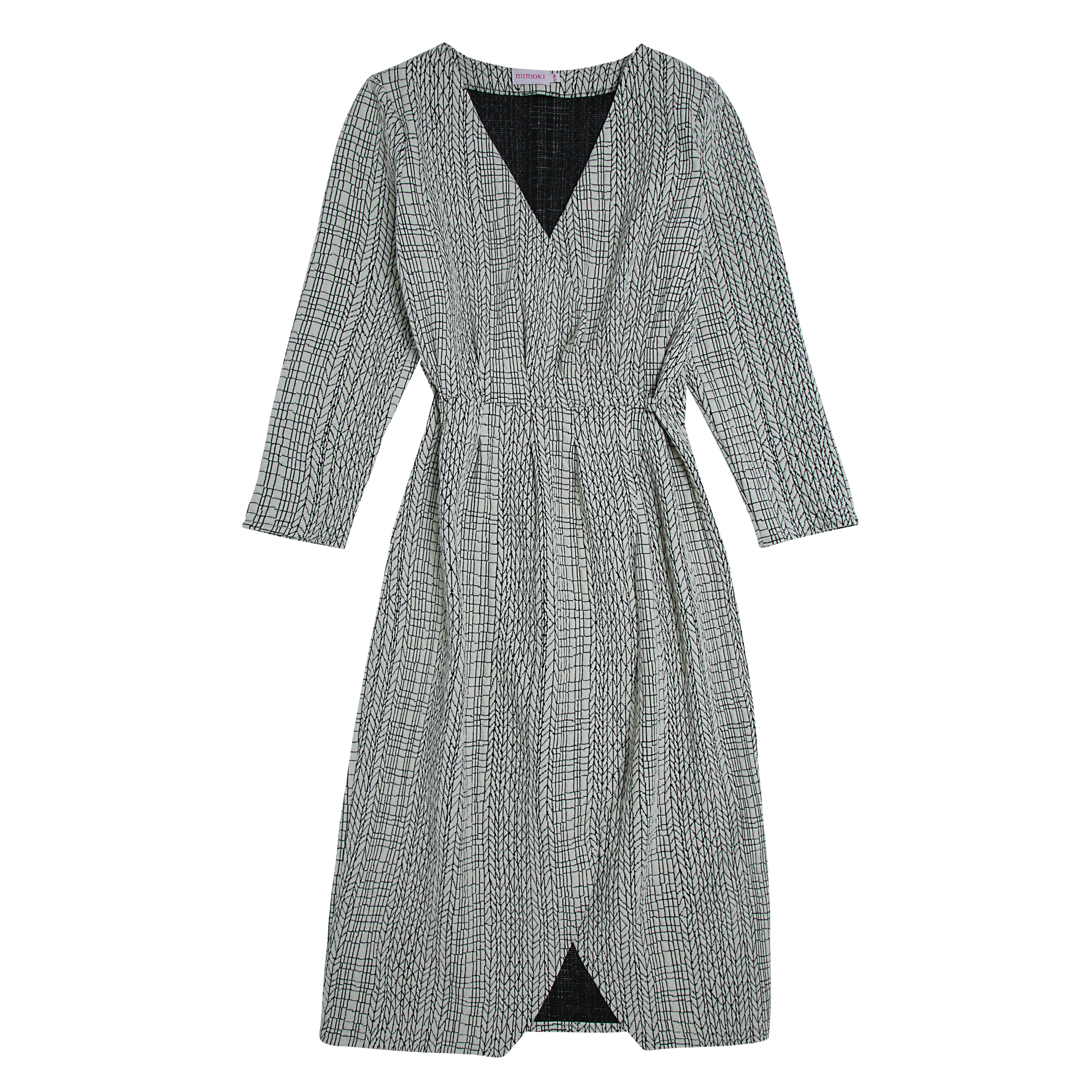 Vestido de manga larga con escote pico y cintura fruncida en punto crudo.